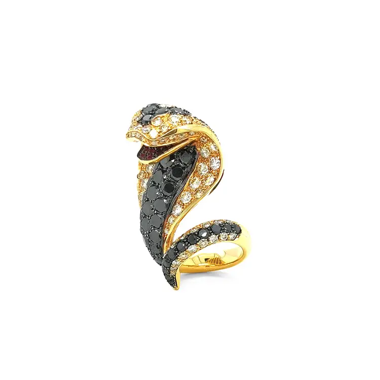 Tâm điểm của nhẫn là 48 viên kim cương đen tự nhiên tổng cộng 8,40 ct (3,50–3,80 mm), tỏa sáng với chiều sâu huyền bí. Bao quanh là 75 viên kim cương trắng tự nhiên tổng 4,90 ct (1,80–2,50 mm), tạo nên sự tương phản đầy quyến rũ. Thiết kế được hoàn thiện với 5 viên ruby tự nhiên tổng 0,26 ct, mang sắc đỏ nồng nàn của đam mê.