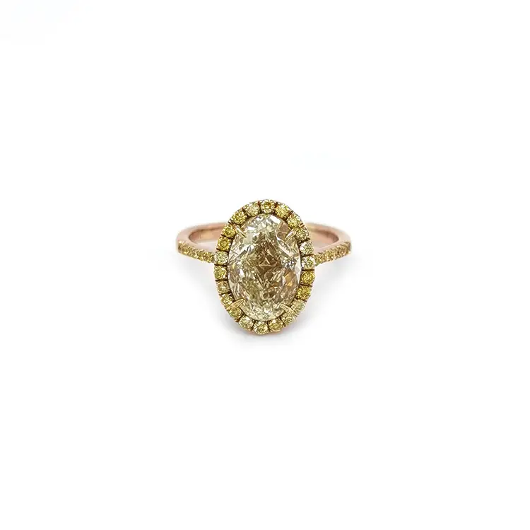 Trung tâm là viên kim cương vàng tự nhiên nặng 3,21 ct, dạng oval, kích thước 10,99 × 7,47 × 5,01 mm, độ tinh khiết VS2. Sắc vàng rực rỡ được tô điểm thêm bởi các viên kim cương vàng nhỏ hơn tổng trọng lượng 0,35 ct, tạo nên sự hòa quyện lộng lẫy và đầy chiều sâu.