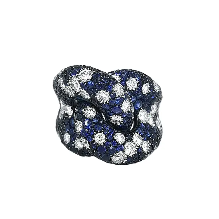 Trung tâm là sapphire xanh tự nhiên 4,20 ct, cắt tròn, sắc độ đậm mang lại chiều sâu và sức cuốn hút. Phần trung tâm ấn tượng được bổ trợ bởi pavé 36 viên kim cương trắng tự nhiên tổng 1,70 ct, cắt tròn (Ø 3,20 mm), độ tinh khiết SI, nước màu G. Kiểu nạm chuẩn xác cùng tương phản sapphire–kim cương nhấn mạnh vẻ quý phái của thiết kế, hoàn thiện trang phục dạ tiệc và tôn vinh phong cách mạnh mẽ, tinh tế, xa hoa của người đeo.