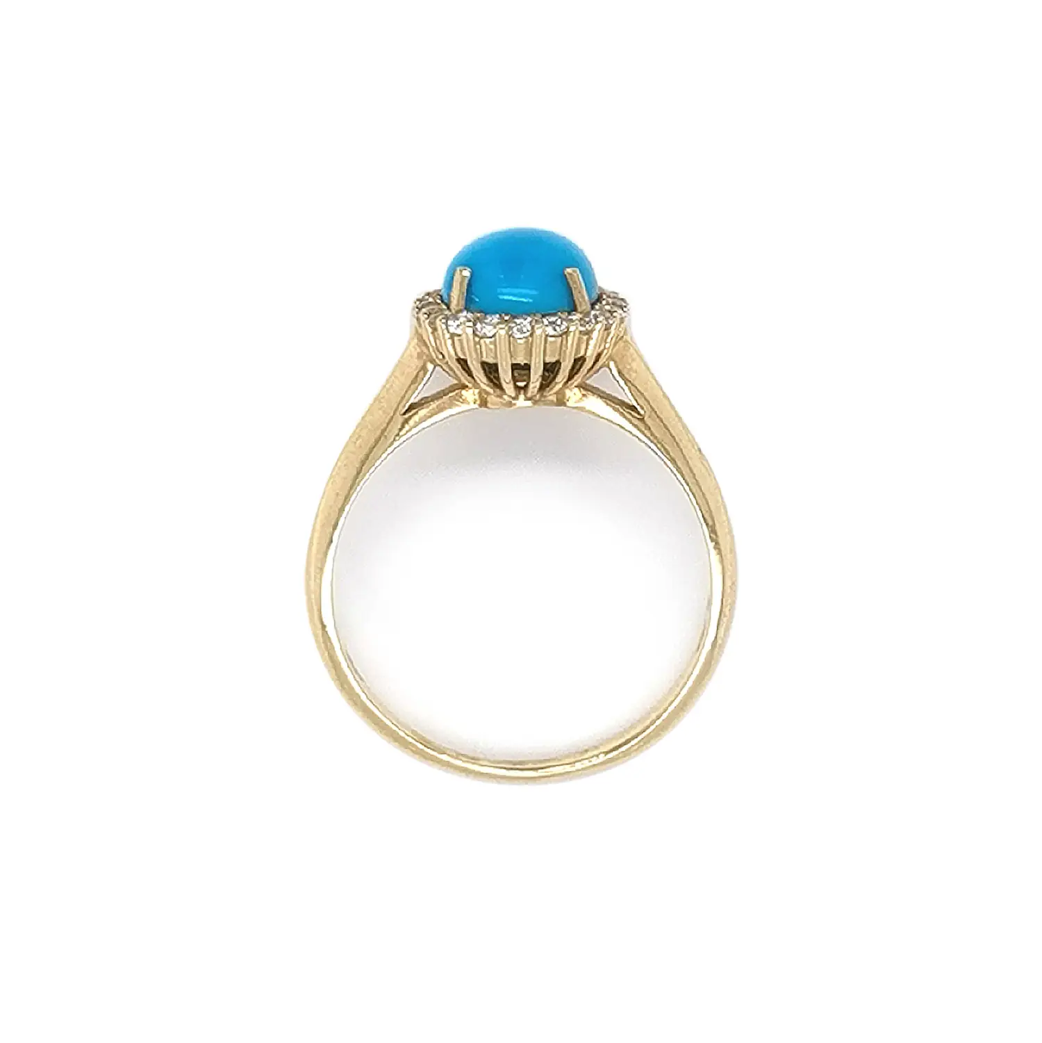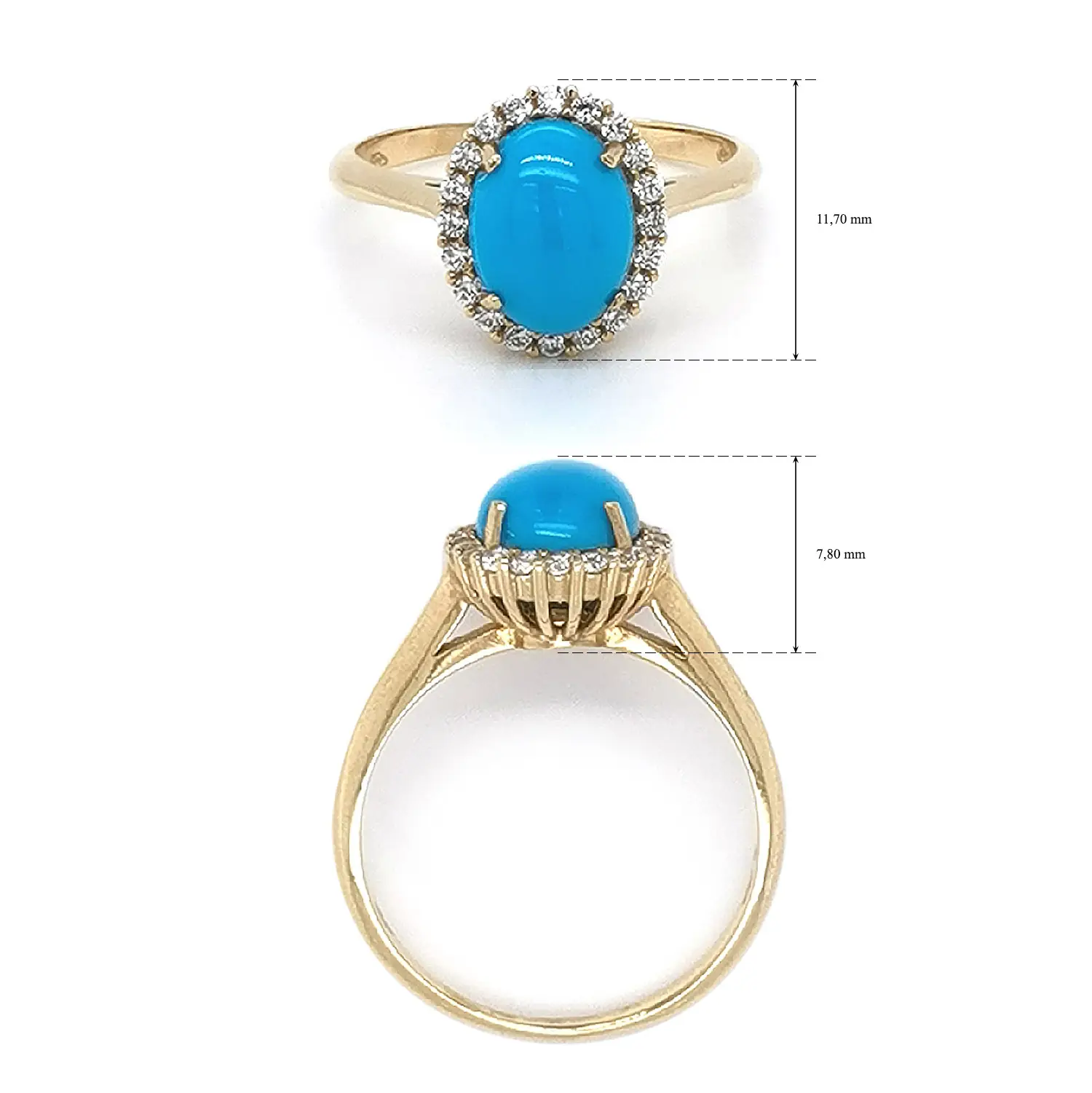 Chiếc nhẫn vàng thanh lịch này nổi bật với viên ngọc lam hình bầu dục, được đặt trong ổ nhẫn tinh xảo và bao quanh bởi vòng zirconia lấp lánh. Sự tương phản giữa sắc xanh rực rỡ và ánh vàng ấm tạo nên một món trang sức nổi bật nhưng vẫn nhẹ nhàng, phù hợp với mọi phong cách.