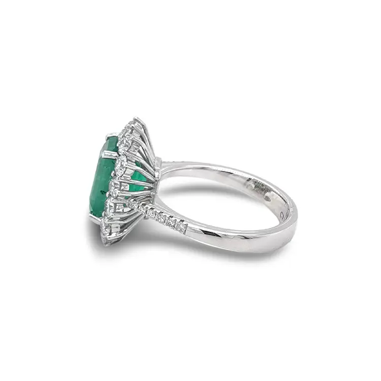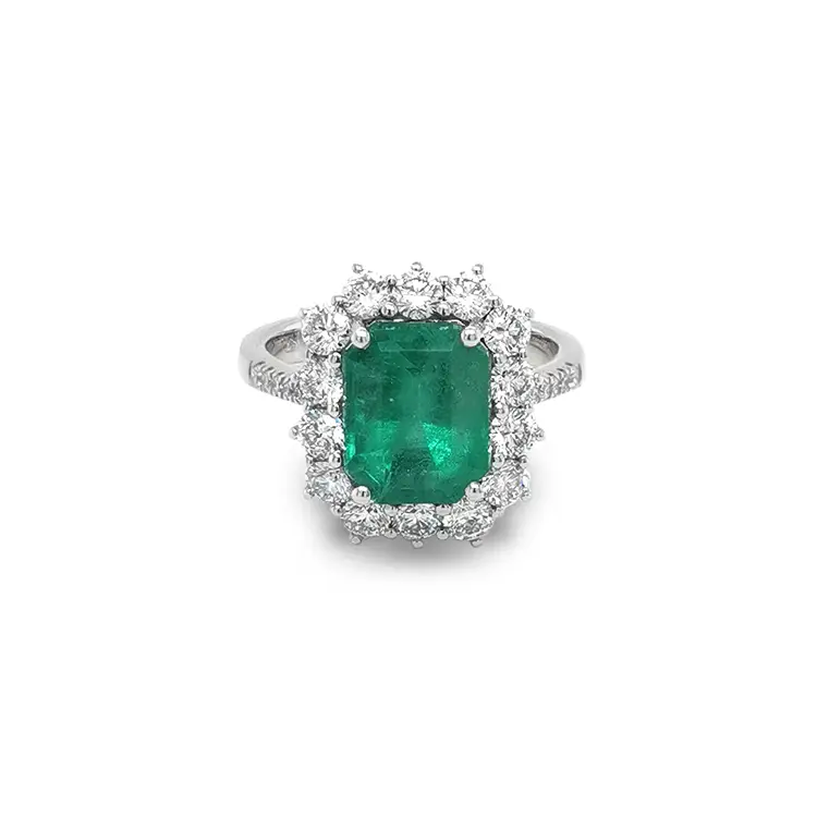 Trung tâm là viên ngọc lục bảo tự nhiên, trọng lượng 3,34 ct, kích thước 9,76 × 7,87 × 6,44 mm, được cắt kiểu emerald (Emerald Cut), làm nổi bật sắc xanh lục sâu thẳm – biểu tượng của sự sống và sự quý phái.