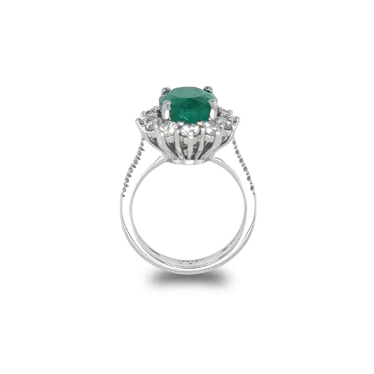 Tâm điểm là viên ngọc lục bảo tự nhiên (Colombia) nặng 3,98 ct, kích thước 11,03 × 8,56 × 7,07 mm, được cắt hình bầu dục (Oval) với sắc xanh lục sâu thẳm biểu trưng cho sự sống và vẻ đẹp vĩnh cửu.