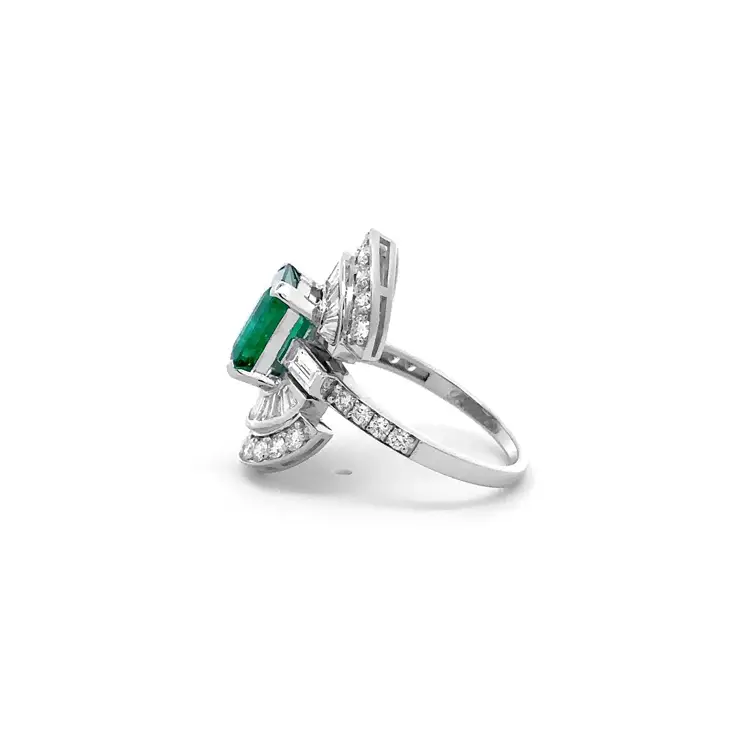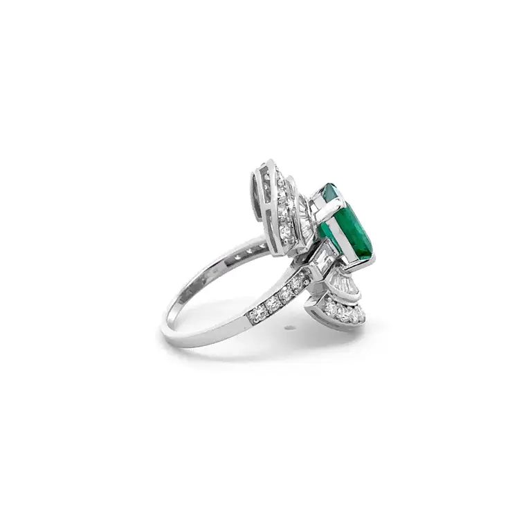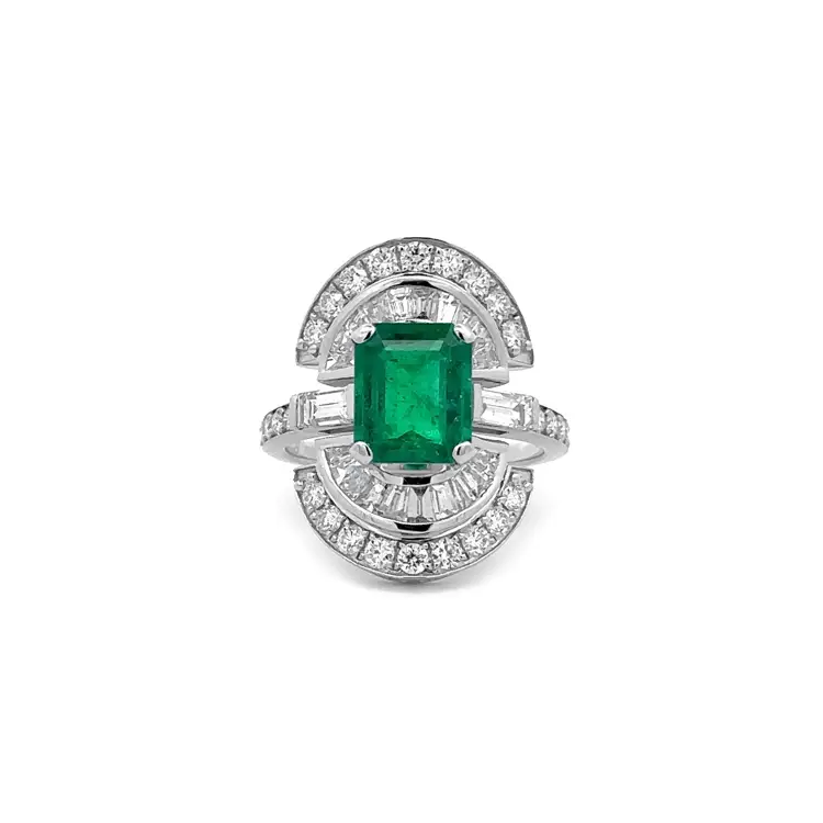 Xung quanh viên đá chính là 22 viên kim cương dáng baguette (0,69 ct) cùng 26 viên kim cương tròn (0,88 ct) được gắn tỉ mỉ, tạo nên quầng sáng lung linh làm nổi bật chiều sâu của ngọc lục bảo. Các viên kim cương màu G, độ trong VS, mang lại hiệu ứng ánh sáng cân bằng giữa sắc trắng tinh khiết và sắc xanh quyến rũ. Với trọng lượng 5,9 g, kích thước 22,40 × 7,70 mm, chiếc nhẫn đạt tới sự hài hòa hoàn mỹ giữa quyền lực và thanh lịch.