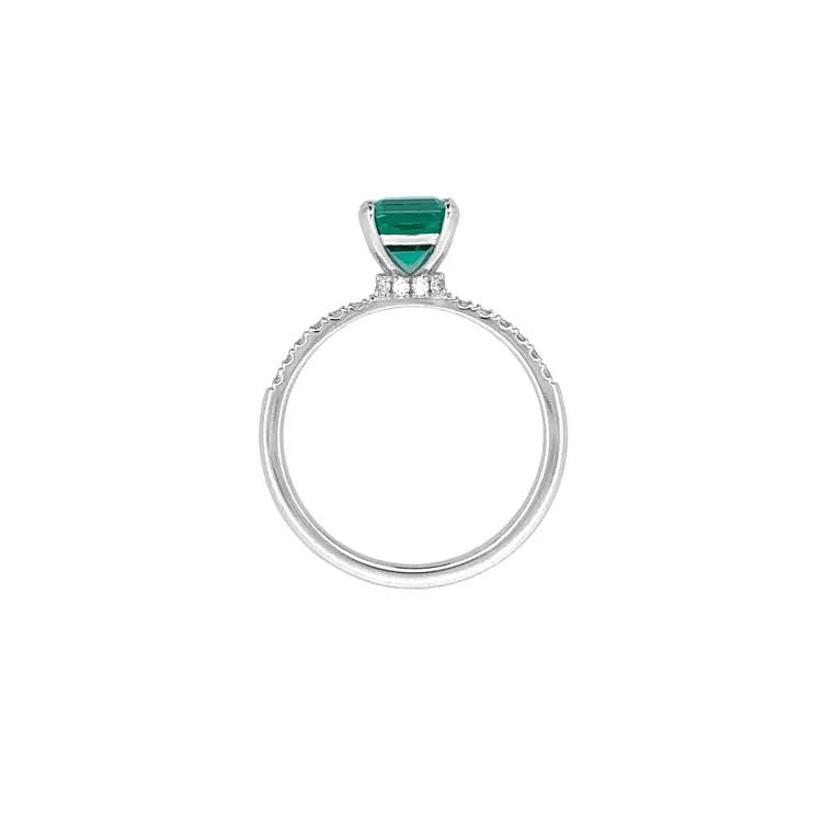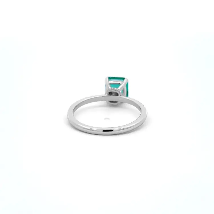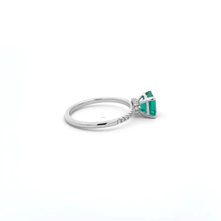 Chiếc nhẫn Beny Jewellery đính ngọc lục bảo và kim cương thể hiện vẻ đẹp thanh lịch và tinh xảo vượt thời gian. Được chế tác từ vàng trắng 18 kt (750/1000) với bề mặt đánh bóng sáng gương, nhẫn thu hút ánh nhìn nhờ tỉ lệ hoàn hảo và phong cách tinh tế. Trung tâm là viên ngọc lục bảo tự nhiên 1,13 ct, cắt dáng Asscher, mang sắc xanh trầm tượng trưng cho sự cân bằng và thanh tao.