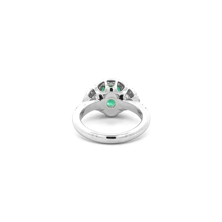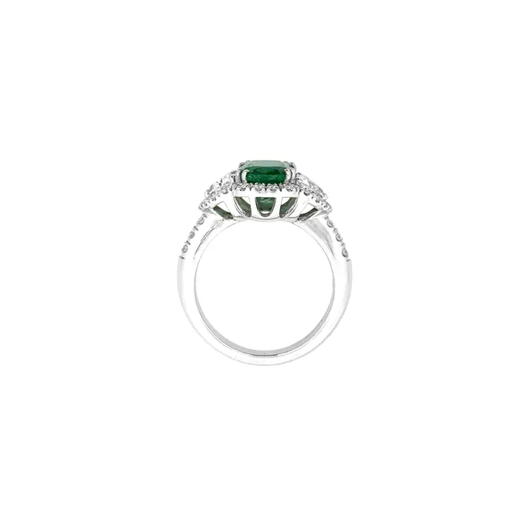 Hai bên viên đá chính được điểm xuyết 2 viên kim cương dáng tam giác (Trilliant, tổng 0,47 ct) và được bao quanh bởi các viên kim cương tròn nhỏ (tổng 0,44 ct, màu G). Mỗi viên đá đều được gắn thủ công tỉ mỉ, tạo nên hiệu ứng ánh sáng chuyển động tinh tế và tôn lên vẻ rực rỡ của ngọc lục bảo. Sự hòa quyện giữa sắc xanh lộng lẫy và ánh trắng tinh khiết của vàng mang đến cảm giác sang trọng nhưng vẫn thanh thoát.