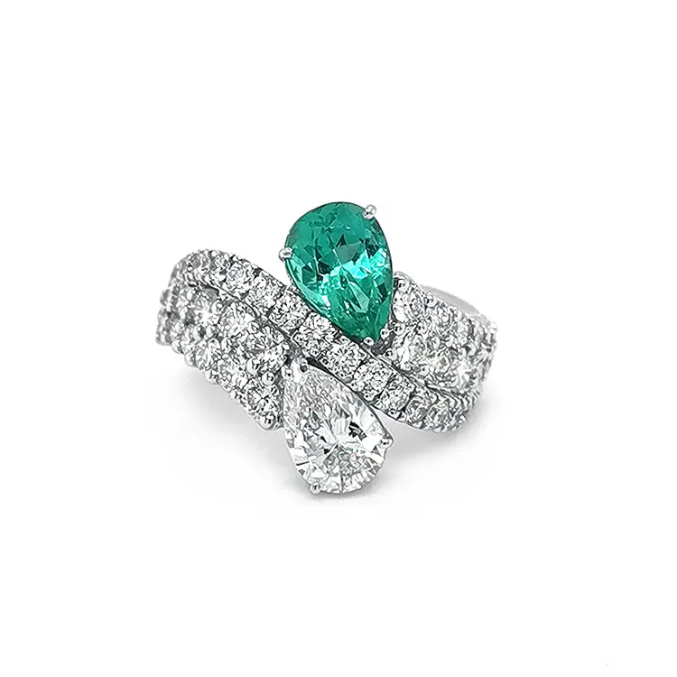 Tâm điểm là ngọc lục bảo 1,34 ct (1 viên), cắt lê (8,40 × 6,60 mm), xanh đậm (nguồn gốc tự nhiên). Điểm nhấn thứ cấp: kim cương 1,03 ct (1 viên), cũng cắt lê (8,80 × 5,80 mm), trắng, độ tinh khiết SI1, nước màu F (tự nhiên). Viền halo kim cương tự nhiên 1,84 ct (47 viên), cắt tròn Ø 2,40 mm, màu trắng, độ tinh khiết SI, nước màu G tăng thêm độ lấp lánh và chiều sâu. Kiểu nạm chuẩn xác làm nổi bật chiều sâu của emerald và sự rực rỡ của kim cương — một thiết kế xa hoa, nổi bật và vượt thời gian thu hút mọi ánh nhìn ngay tức thì.