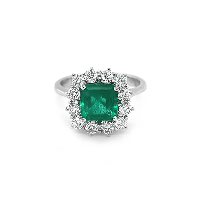 Trung tâm của chiếc nhẫn là viên ngọc lục bảo tự nhiên nặng 1,60 ct, cắt dáng Emerald (7,60 × 6,90 mm). Bao quanh là 12 viên kim cương tự nhiên tổng cộng 0,78 ct (kích thước 2,20 mm, màu G, độ trong VS), tạo nên ánh sáng lung linh rực rỡ.