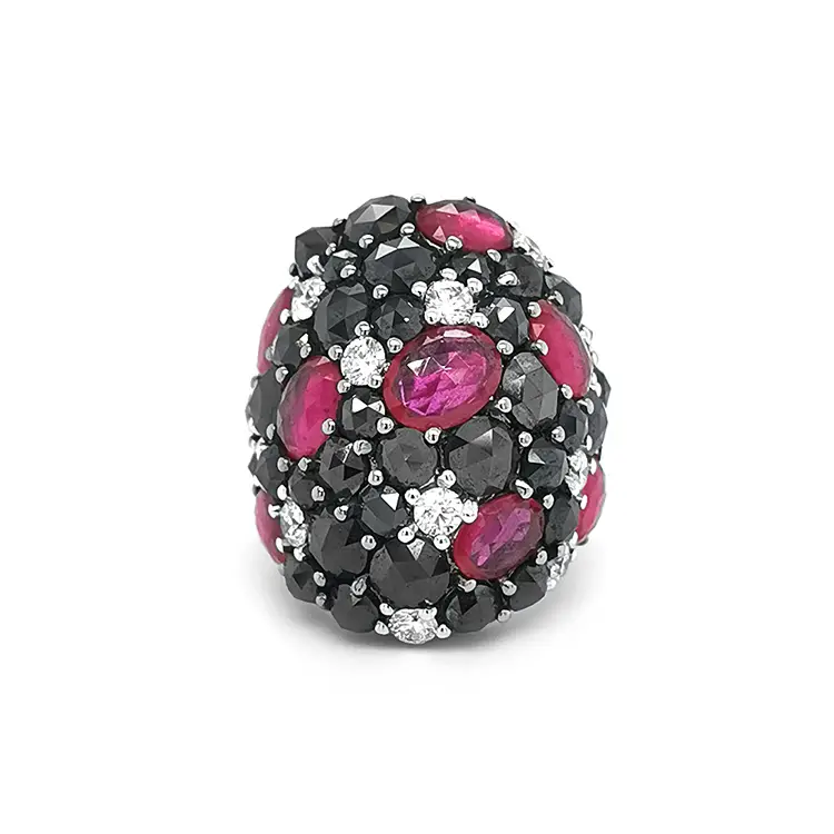 Nhẫn vàng đính ruby, kim cương đen và trắng