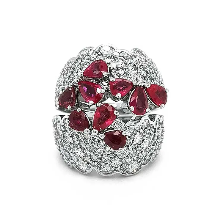 Nhẫn được đính 9 viên hồng ngọc tự nhiên tổng trọng lượng 3,35 ct (5,80 × 4,40 mm), sắc đỏ rực rỡ tượng trưng cho tình yêu và sức mạnh. Bao quanh là 160 viên kim cương trắng tự nhiên tổng 4,54 ct (1,90 mm, màu G–H, độ tinh khiết VS), tạo nên hào quang lấp lánh quanh trung tâm hồng ngọc.