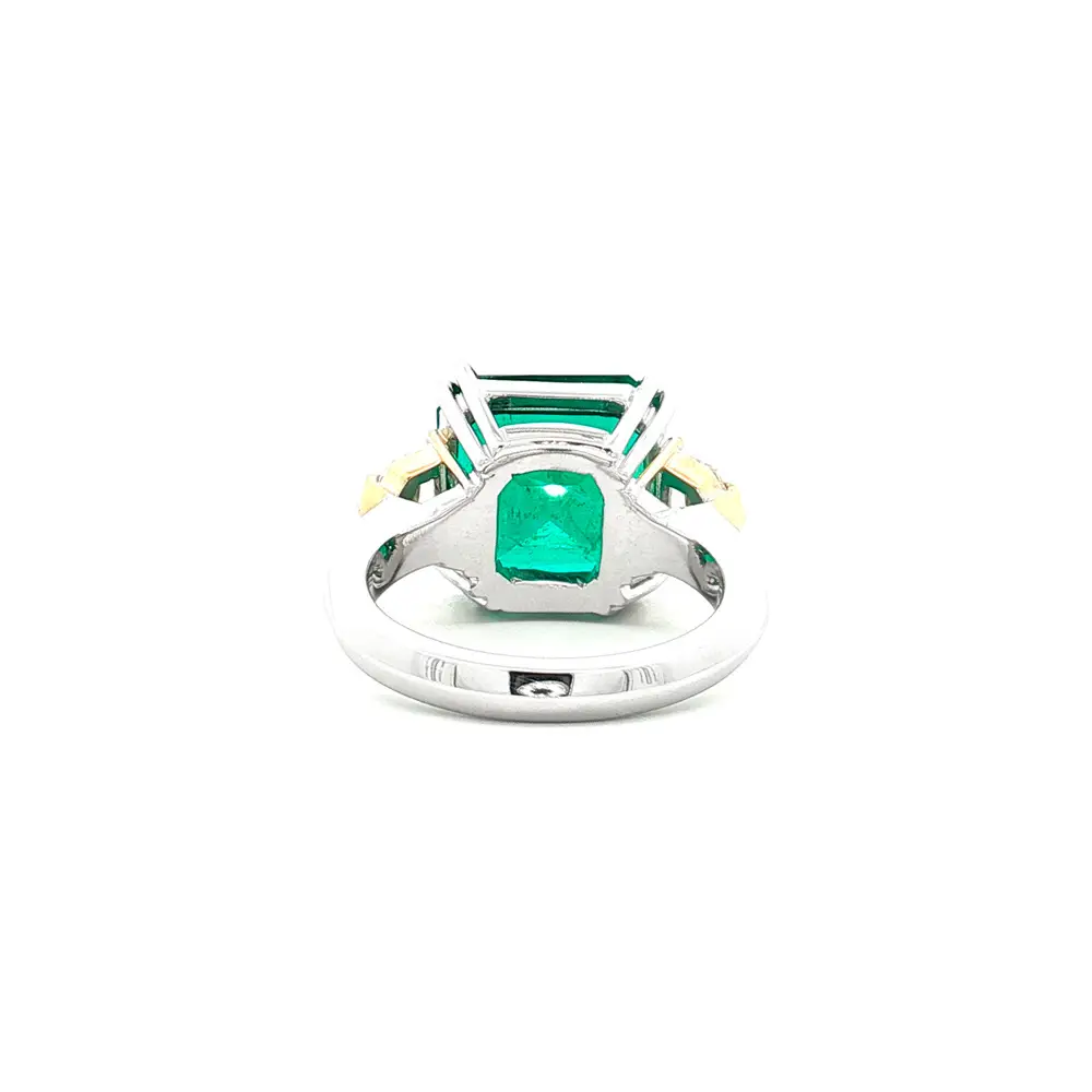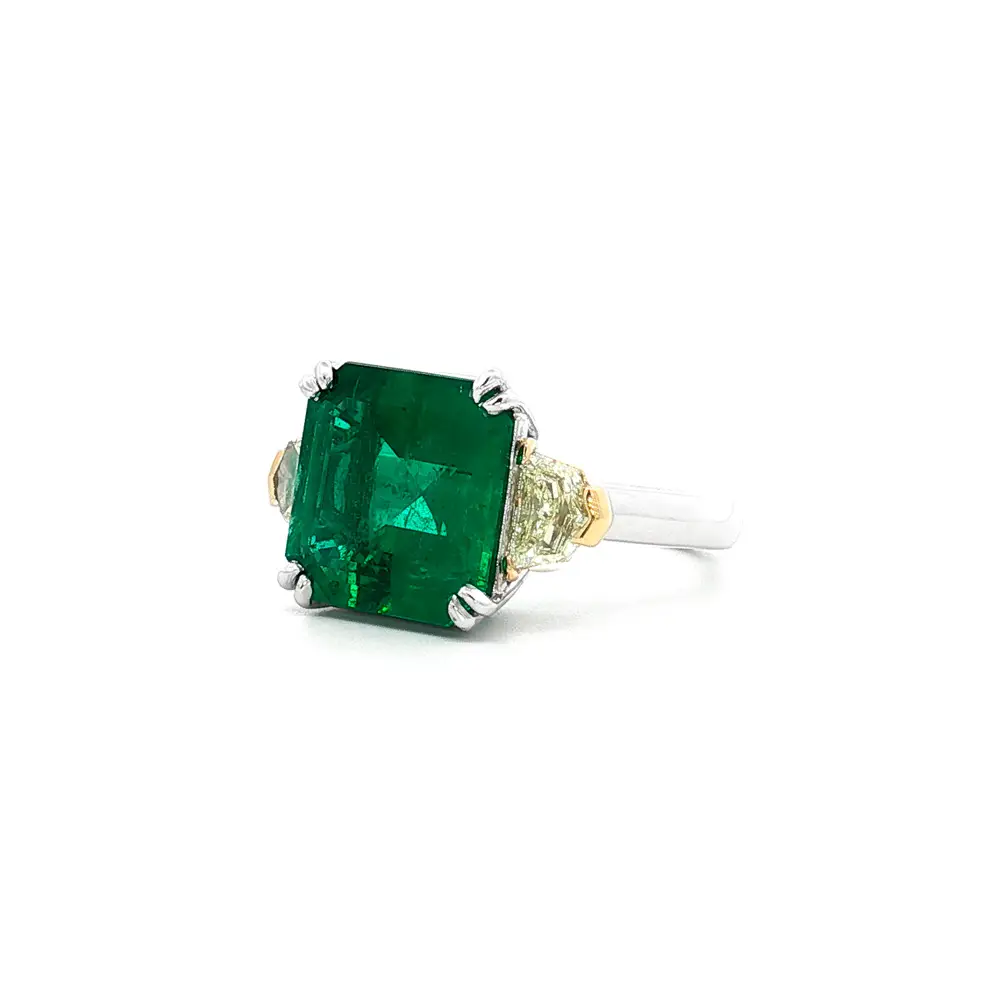 Chiếc nhẫn độc quyền này được chế tác từ vàng hai tông và nổi bật với viên ngọc lục bảo cắt emerald nặng 5,85 ct, tỏa sáng với sắc xanh đậm đầy cuốn hút. Viên đá tuyệt đẹp này tượng trưng cho sự hòa hợp, sức mạnh và vĩnh cửu, mang lại vẻ cao quý và cá tính cho thiết kế.