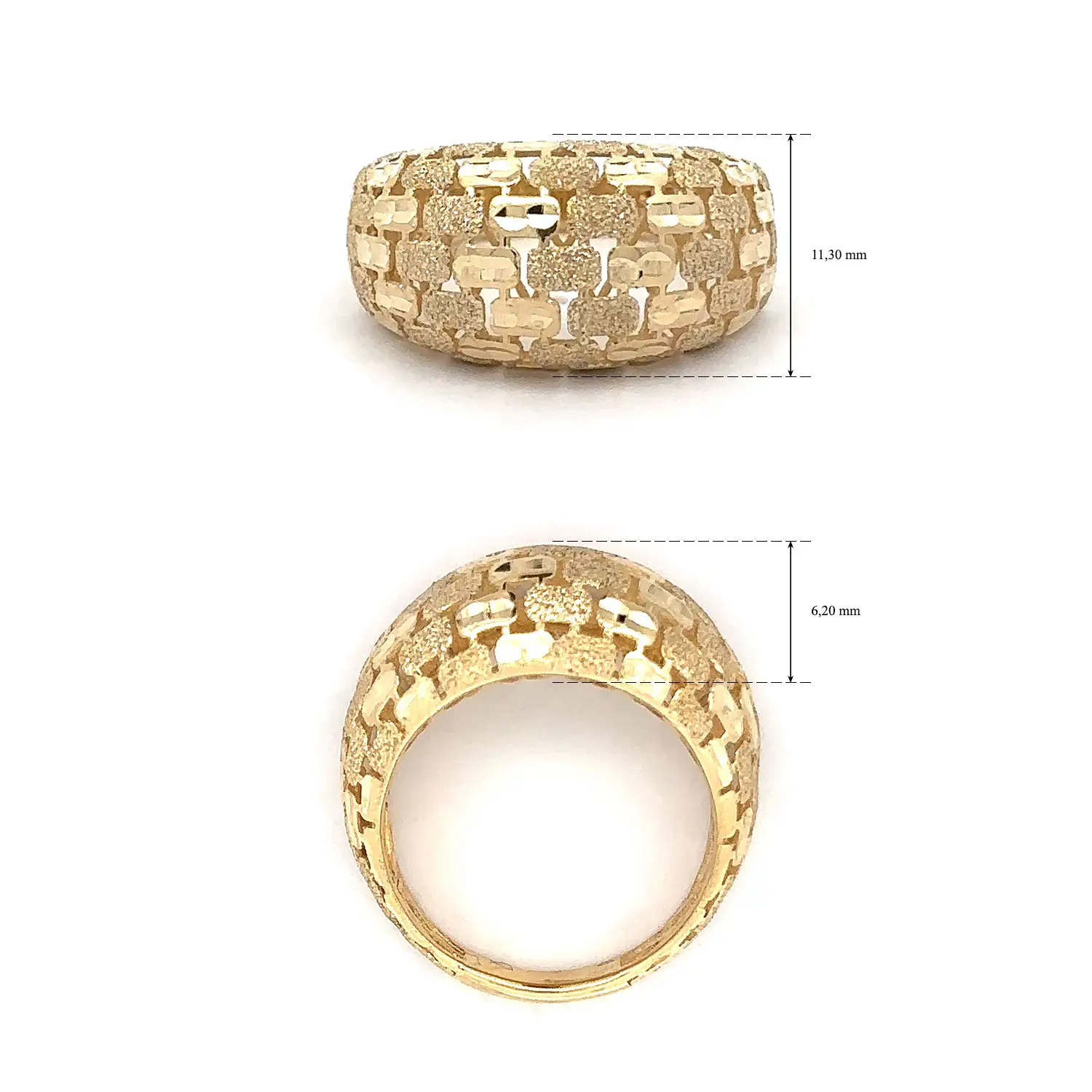 Chiếc nhẫn vàng họa tiết mosaic nổi bật nhờ thiết kế độc đáo, kết hợp tinh tế giữa những mảng vàng bóng mịn và các chi tiết phun cát nhám. Sự tương phản này tạo nên hiệu ứng ánh sáng đầy cuốn hút, mang đến chiều sâu và vẻ đẹp đặc trưng cho chiếc nhẫn. Được chế tác từ vàng vàng cao cấp, nhẫn toát lên vẻ ấm áp, sang trọng và ôm lấy ngón tay một cách đầy thanh lịch.