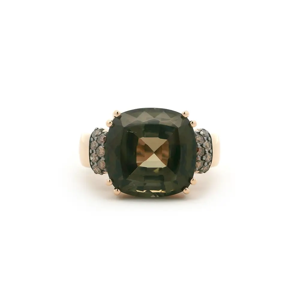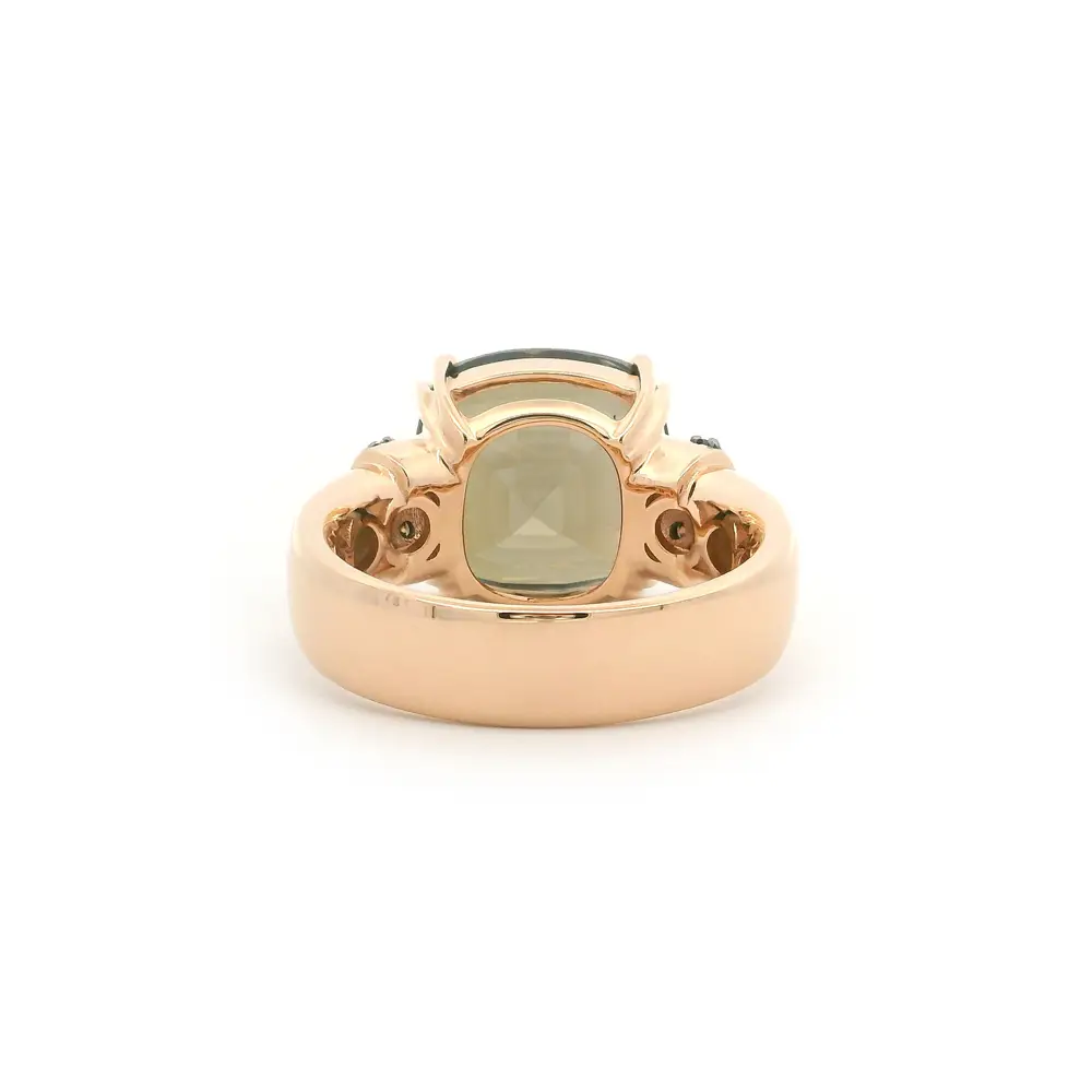 Chiếc nhẫn tinh tế này được chế tác từ vàng hồng 18K, mang đến sự kết hợp hài hòa giữa các tông màu ấm áp. Ở trung tâm là viên tourmaline xanh lá cắt hình đệm, nổi bật với sắc xanh sâu quyến rũ. Hai bên được đính kim cương nâu lấp lánh, tạo chiều sâu và vẻ sang trọng tinh tế.