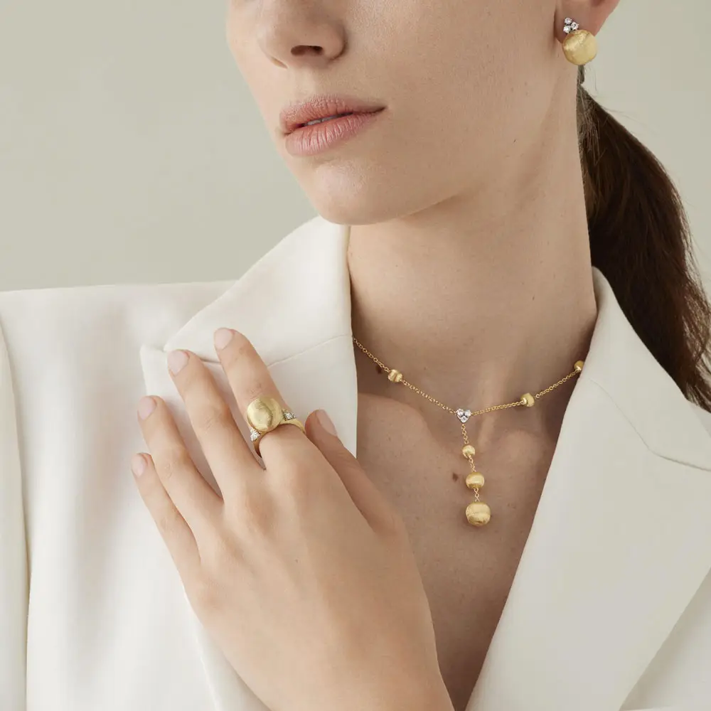 Bộ sưu tập Africa của Marco Bicego lấy cảm hứng từ vẻ đẹp của thiên nhiên và phong cảnh châu Phi. Những hình khối tròn đặc trưng gợi nhớ ánh mặt trời ấm áp, những đụn cát vàng và nguồn năng lượng bất tận phản chiếu trong từng chi tiết trang sức.