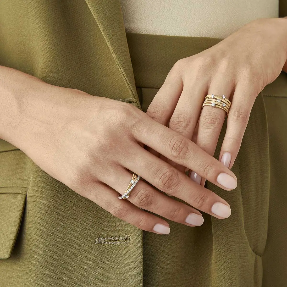 Mỗi tác phẩm được chế tác thủ công, những dải vàng được uốn cong và đan xen khéo léo để tạo hiệu ứng chuyển động tự nhiên và mềm mại. Goa có sẵn trong vàng vàng, vàng trắng và vàng hồng, thường được tô điểm bằng kim cương lấp lánh, tôn vinh sự tinh khiết mang tính kiến trúc của thiết kế.