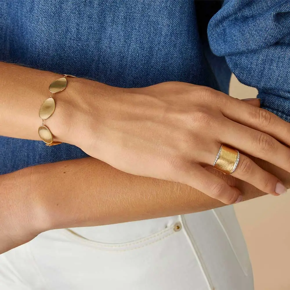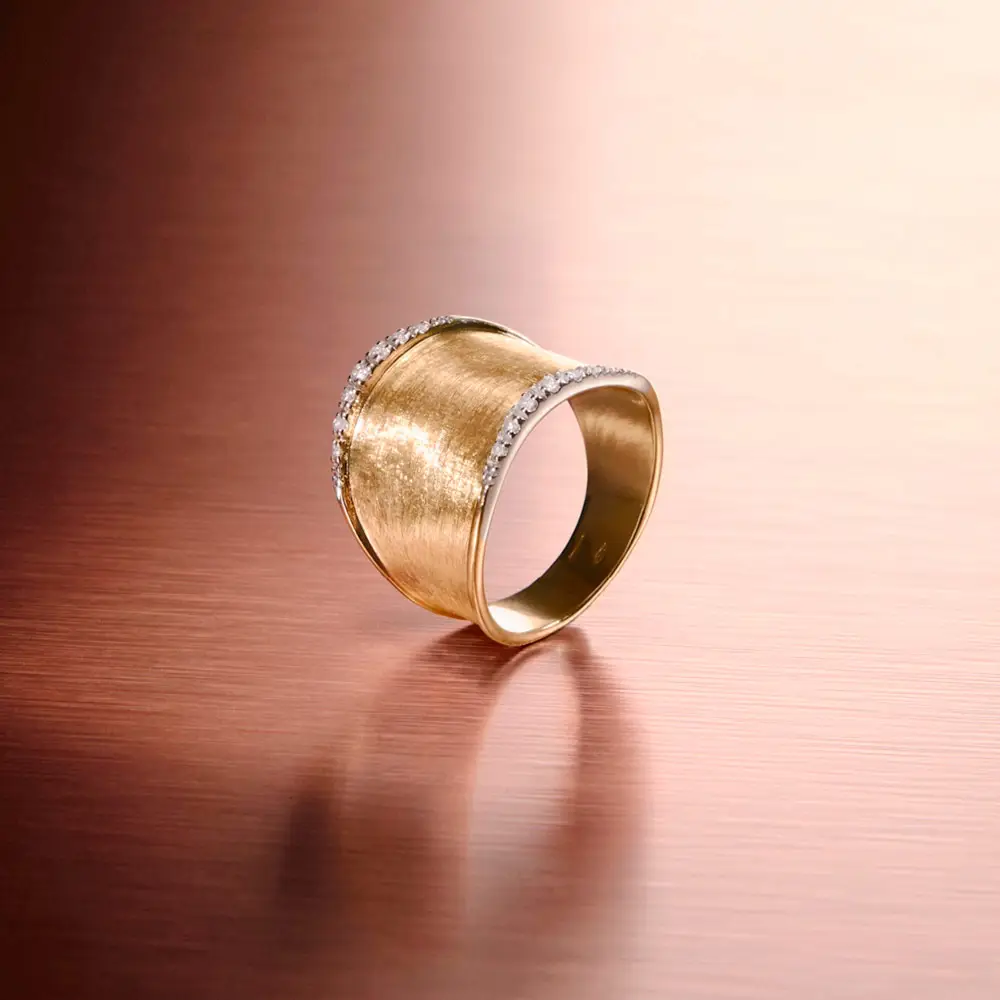 Mỗi tác phẩm được chế tác thủ công theo kỹ thuật truyền thống trong xưởng Marco Bicego. Bề mặt vàng được khắc bulino thủ công, tạo hiệu ứng mờ mịn như nhung. Chi tiết này mang lại sự tương phản độc đáo giữa nét mềm mại của hình khối và chiều sâu của cấu trúc kim loại.