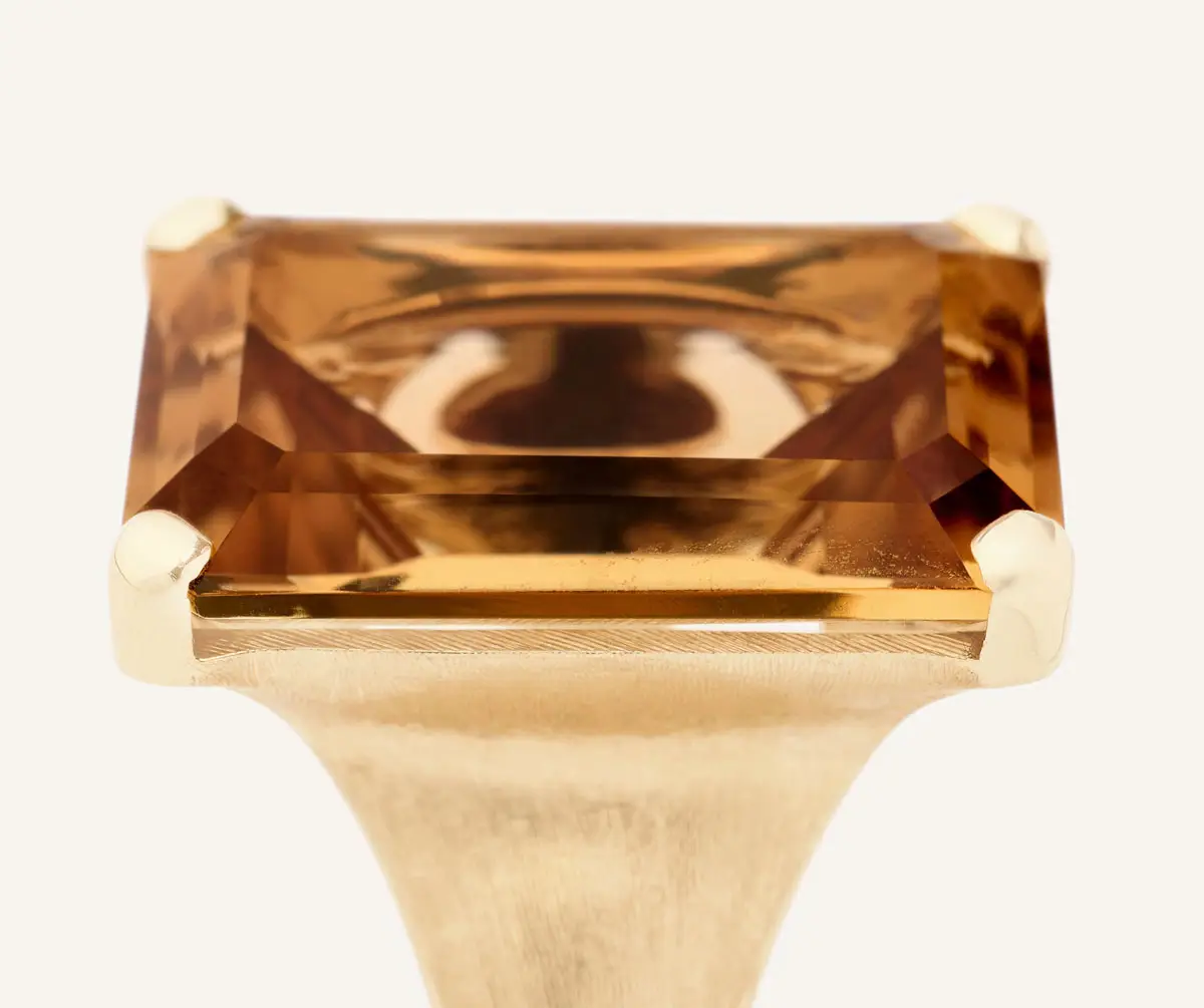 Trung tâm nhẫn là một viên quartz tự nhiên (thạch anh) cắt Emerald (hình chữ nhật kiểu smaragd). Viên đá duy nhất này tạo điểm nhấn tinh tế mà không lấn át tổng thể.