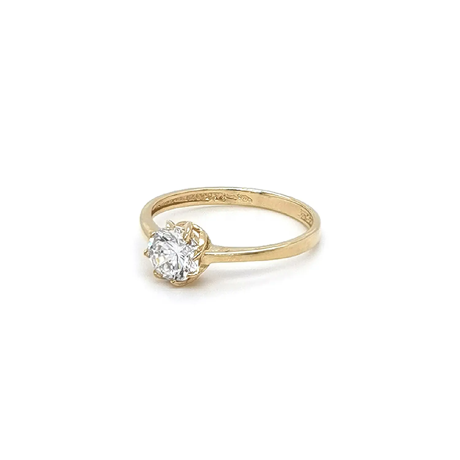 Chiếc nhẫn vàng đính zircon này thể hiện vẻ đẹp thanh lịch vượt thời gian. Vòng nhẫn vàng vàng mảnh mai giữ viên zircon trong suốt được cắt gọt tinh xảo, đặt trong ổ đá kiểu cổ điển giúp viên đá bắt sáng rực rỡ theo từng chuyển động. Thiết kế tối giản làm nổi bật vẻ đẹp của viên đá, mang đến tổng thể hài hòa phù hợp với mọi phong cách.