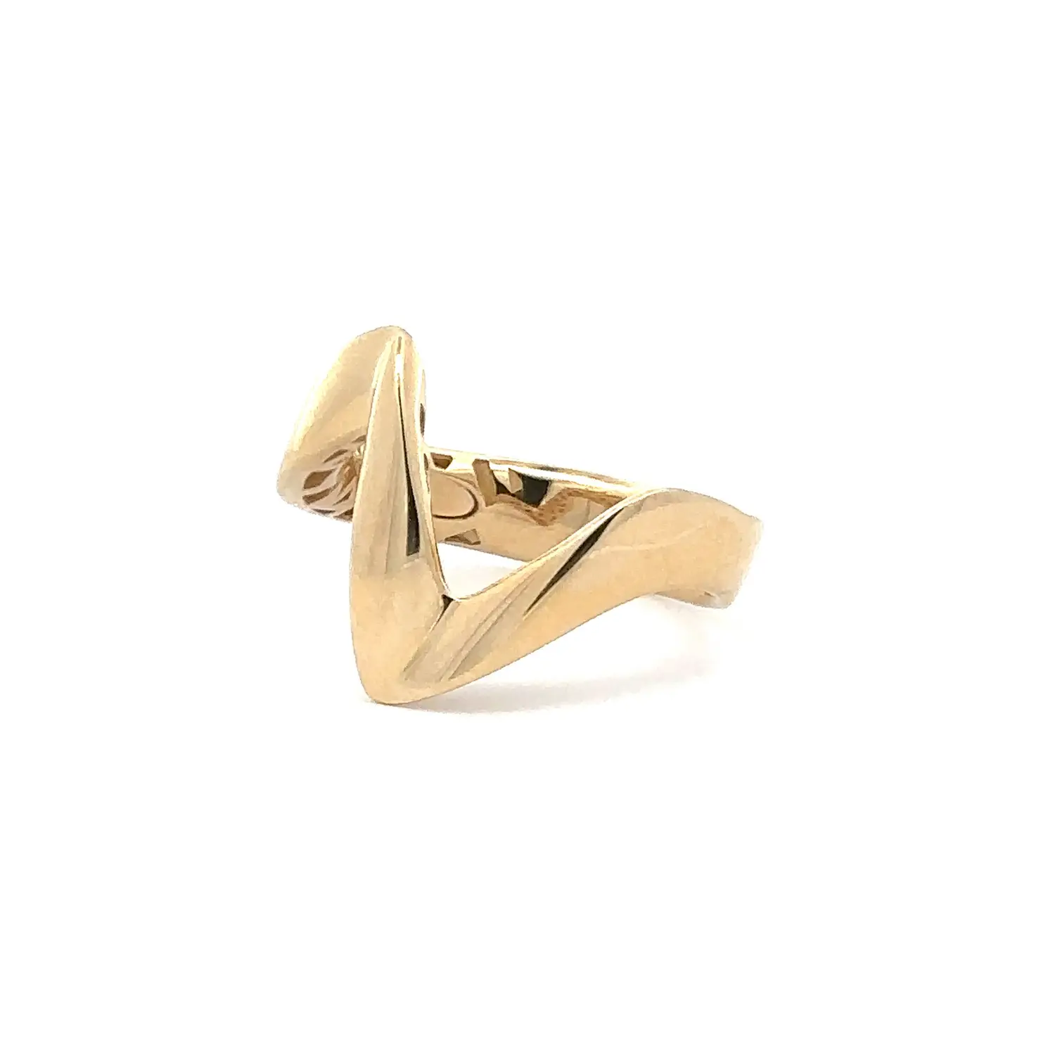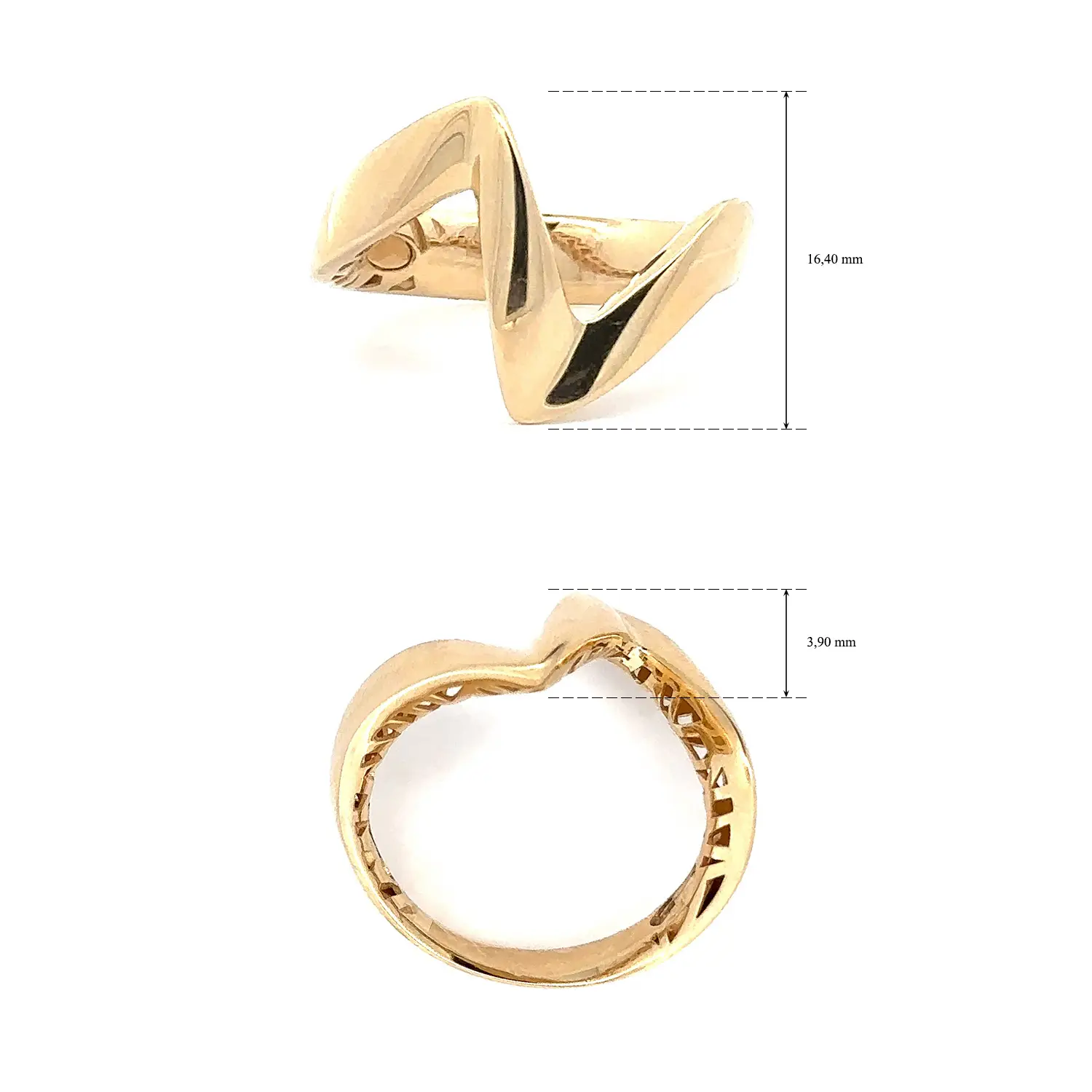 Chiếc nhẫn ấn tượng này nổi bật với kiểu dáng hình học bất đối xứng, tạo nên đường nét thanh lịch với sự kết hợp giữa các góc cạnh sắc sảo và chuyển động mềm mại. Bề mặt vàng vàng được đánh bóng sáng gương làm nổi bật tính hiện đại và tôn lên đường cong động đầy khác biệt so với những mẫu nhẫn truyền thống. Hơi hướng kiến trúc trong thiết kế mang đến vẻ đẹp táo bạo và đương đại.