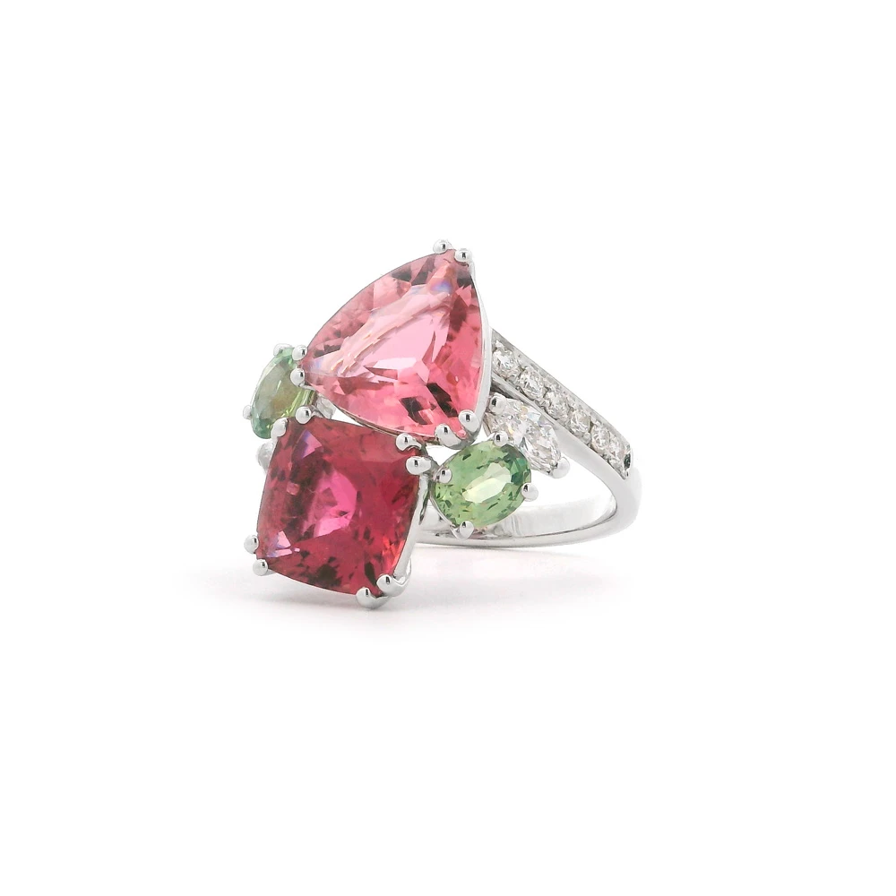 Chiếc nhẫn quyến rũ này được chế tác từ vàng trắng 18K, tỏa sáng với sự kết hợp hài hòa của màu sắc và hình khối. Tâm điểm là hai viên tourmaline hồng nổi bật, được cắt theo kiểu dáng độc đáo, thu hút mọi ánh nhìn với sắc độ mãnh liệt và rực rỡ.