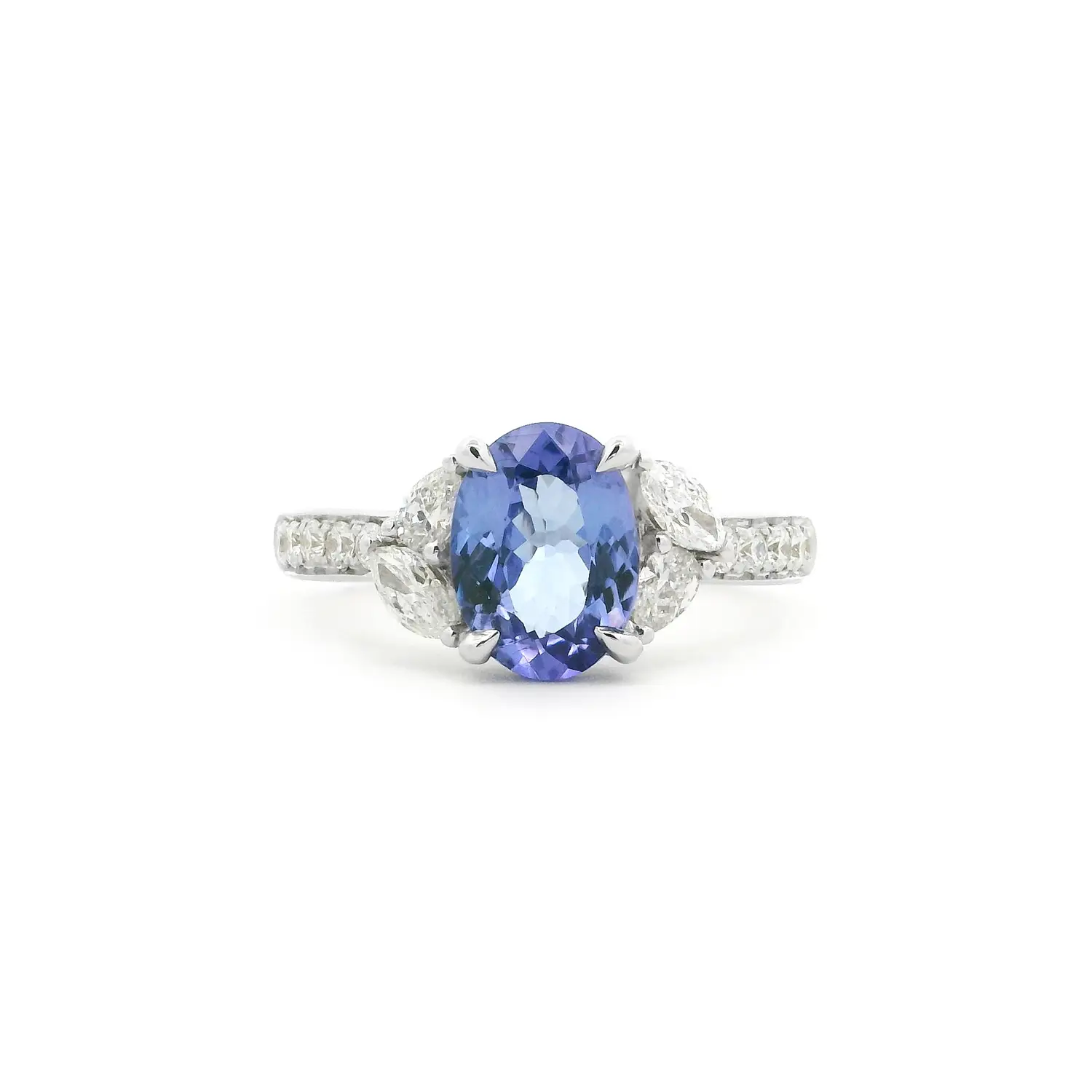 Chiếc nhẫn vàng trắng đính đá tanzanite và kim cương này là sự kết hợp hoàn hảo giữa màu sắc, ánh sáng và vẻ đẹp thanh lịch. Ở trung tâm là viên tanzanite cắt hình bầu dục, tỏa ra sắc tím-xanh huyền ảo thay đổi theo ánh sáng. Là loại đá quý chỉ được tìm thấy tại Tanzania, tanzanite tượng trưng cho sự độc đáo, trực giác và sức mạnh nội tâm. Hai bên được tô điểm bằng kim cương cắt dáng marquise và oval, làm nổi bật chiều sâu và ánh sáng của viên đá chính.