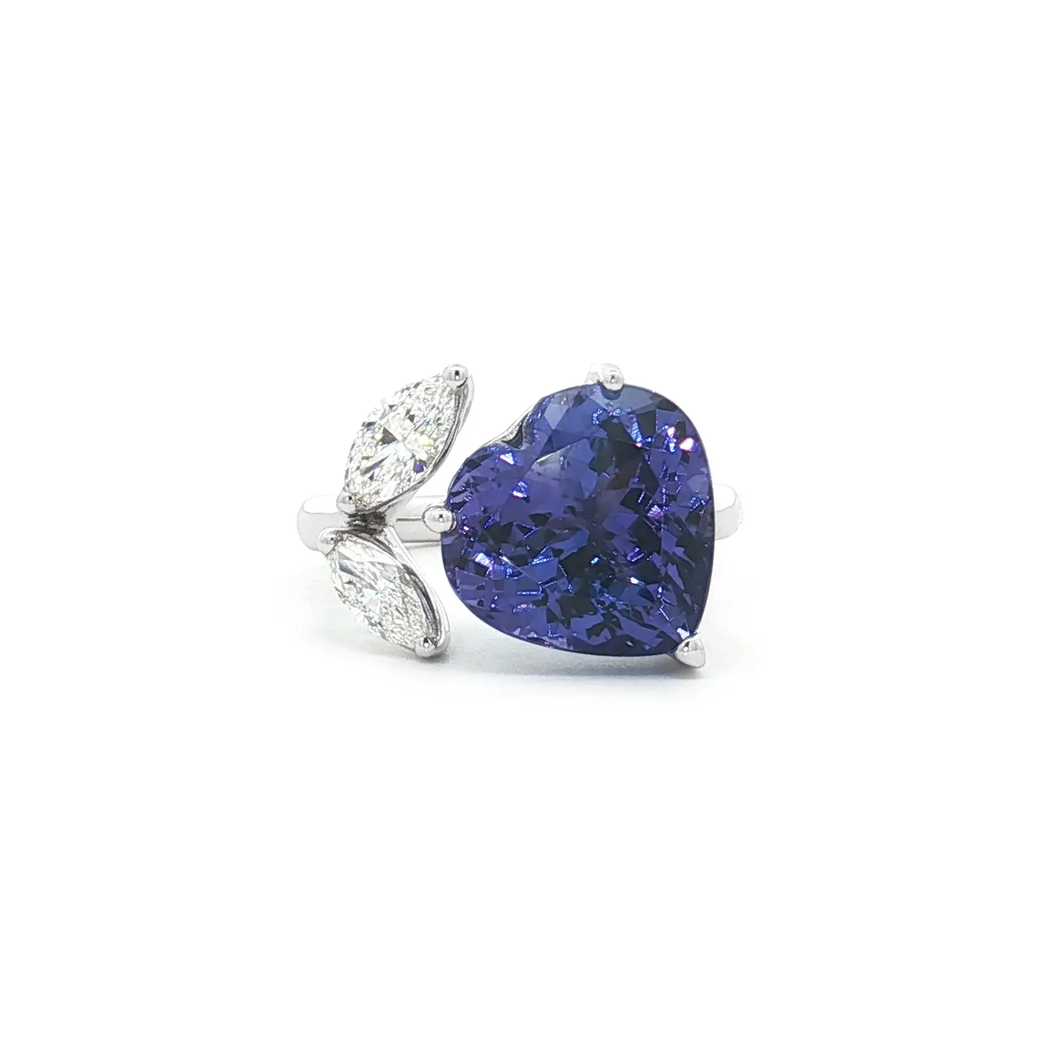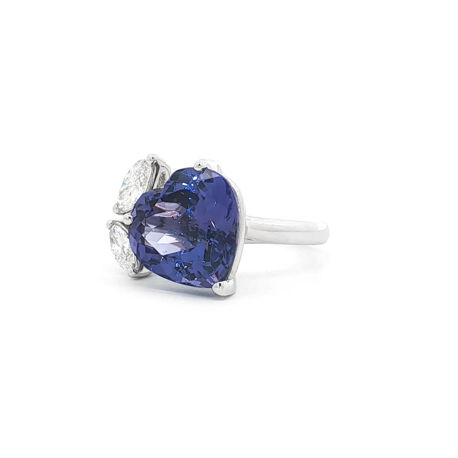 Chiếc nhẫn vàng trắng đính đá tanzanite và kim cương này là sự hòa quyện hoàn hảo giữa tình yêu, sự thanh lịch và phong cách hiện đại. Tâm điểm của thiết kế là viên tanzanite cắt hình trái tim, tỏa ra sắc tím-xanh quyến rũ thay đổi theo ánh sáng – từ gam tím oải hương nhẹ đến ánh lam sâu thẳm. Được khai thác duy nhất tại Tanzania, tanzanite tượng trưng cho sự biến đổi, trực giác và sức mạnh nội tâm.