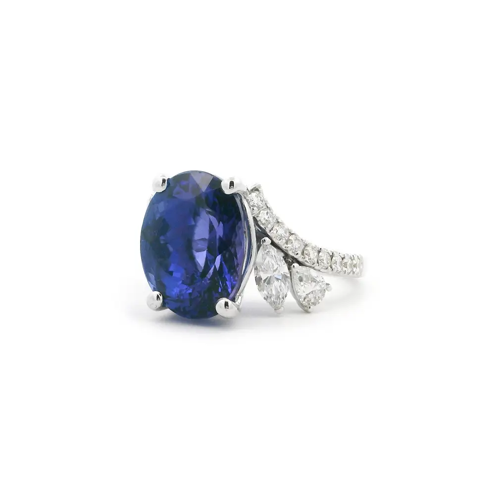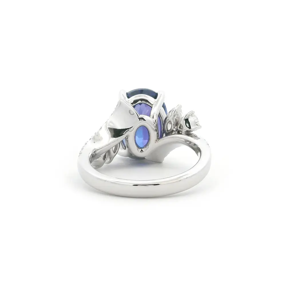 Chiếc nhẫn vàng trắng 18K tuyệt mỹ này thể hiện sự hòa quyện hoàn hảo giữa nét thanh lịch, đam mê và sang trọng. Ở trung tâm là một viên tanzanit hình bầu dục rực rỡ, mang sắc xanh tím sâu thẳm và ánh sáng cuốn hút.