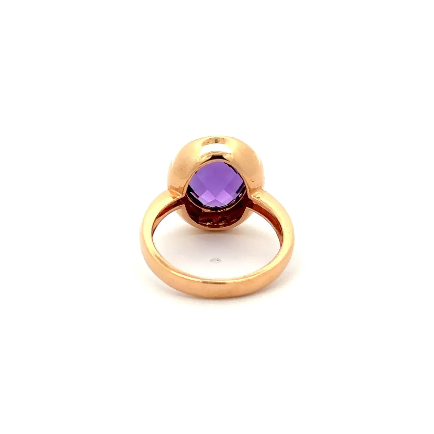 Chiếc nhẫn vàng với đá ametyst hình bầu dục này mang đến sự kết hợp hài hòa giữa vẻ đẹp thanh lịch và sắc màu nổi bật. Viên ametyst được cắt gọt tinh xảo với tông tím đậm quyến rũ, nổi bật trong ổ vàng trơn nhẵn giúp tôn lên độ sáng và chiều sâu của viên đá. Thiết kế đường nét đơn giản tạo nên vẻ ngoài dễ phối, phù hợp với mọi phong cách và dịp sử dụng.
