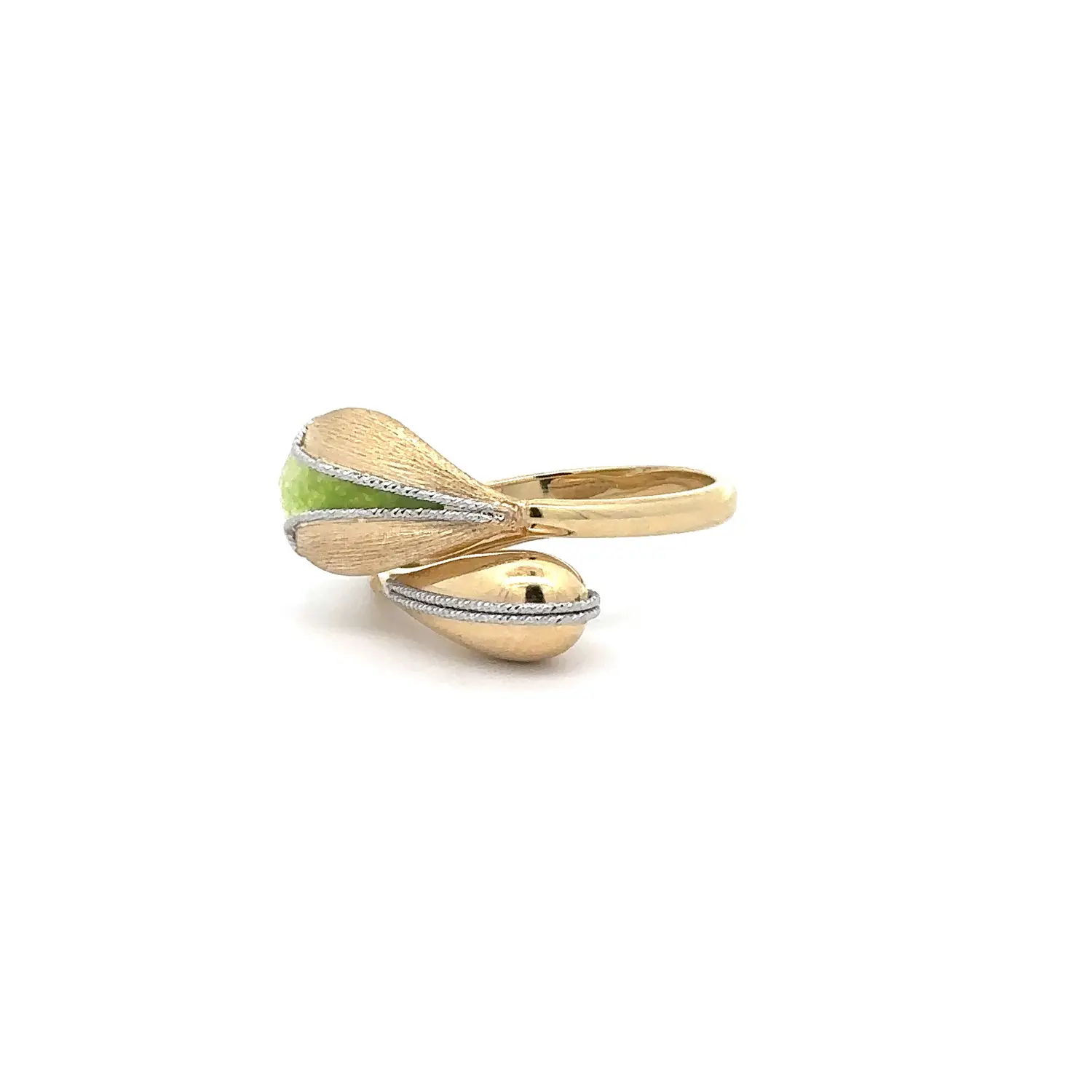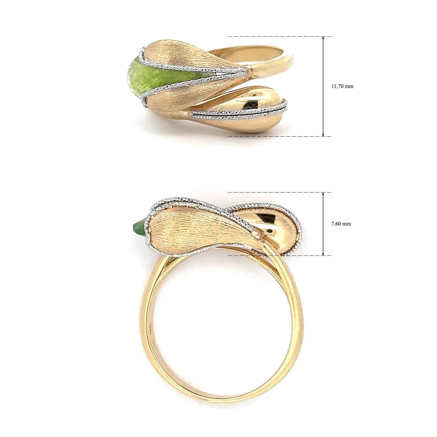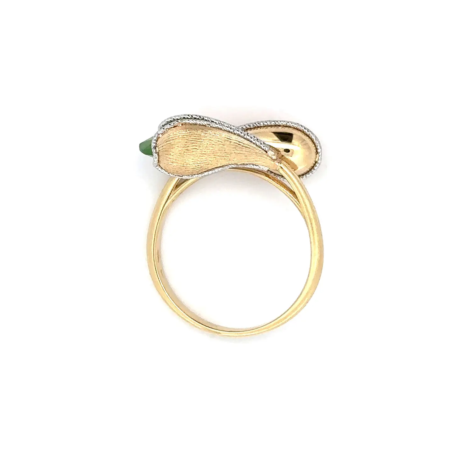Chiếc nhẫn vàng với đá xanh này gây ấn tượng ngay từ ánh nhìn đầu tiên bởi đường nét hữu cơ và sự hòa quyện tinh tế của bề mặt. Phần vàng vàng được khắc tay tạo hiệu ứng mờ mềm mại, tương phản đẹp mắt với đường viền trắng bóng. Ở trung tâm là một viên đá xanh tự nhiên dạng thuôn dài, mang đến sắc thái tươi sáng và điểm nhấn sang trọng. Mỗi chi tiết đều toát lên sự nhẹ nhàng, tinh tế và đầy nghệ thuật.