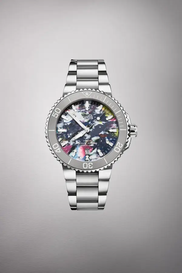 Điểm nhấn đặc biệt là mặt số được làm từ nhựa PET tái chế, khiến mỗi chiếc đồng hồ đều duy nhất – không có hai chiếc nào giống nhau. Thiết kế này thể hiện sứ mệnh bảo vệ môi trường và đại dương của Oris. Bộ máy tự động Oris Calibre 733 mang lại dự trữ năng lượng khoảng 41 giờ, có thể nhìn thấy qua nắp lưng trong suốt.