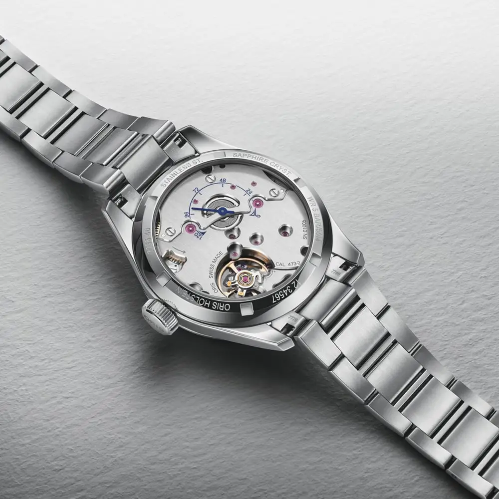 Đồng hồ sử dụng bộ máy Oris 473 lên cót tay với thời gian trữ cót 120 giờ (5 ngày), tần số 28,800 vph (4 Hz) và có hiển thị mức năng lượng. Máy bền bỉ và có bảo hành 10 năm.