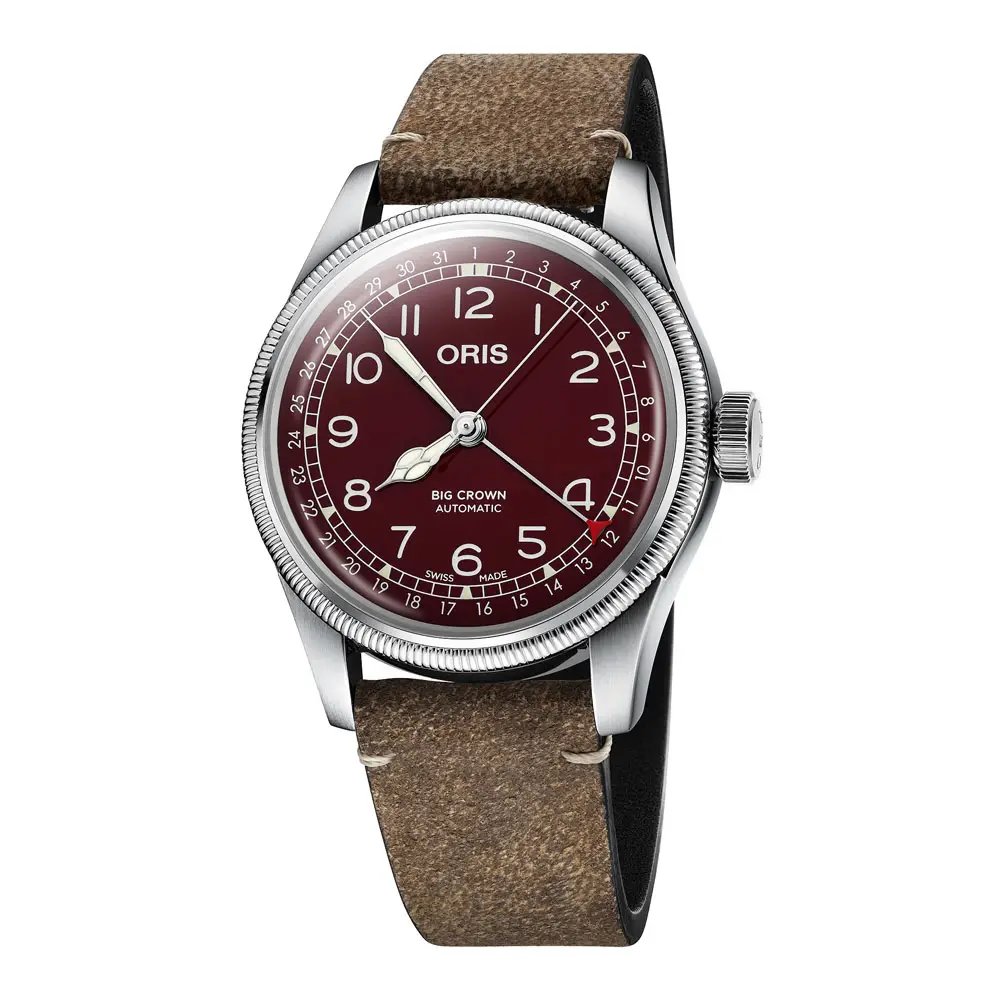 Oris Big Crown Pointer Date 01-754-7741-4068-07 5 20 50 là mẫu đồng hồ cơ nam lấy cảm hứng từ thiết kế phi công cổ điển, đặc trưng của bộ sưu tập Big Crown từ năm 1938. Vỏ đồng hồ đường kính 40 mm được làm từ thép không gỉ và trang bị núm vặn lớn đặc trưng giúp thao tác dễ dàng ngay cả khi đeo găng tay. Đồng hồ nổi bật với mặt số màu đỏ rượu vang (bordeaux) cùng các chữ số Ả Rập và kim phủ dạ quang, đảm bảo khả năng đọc giờ tốt.
