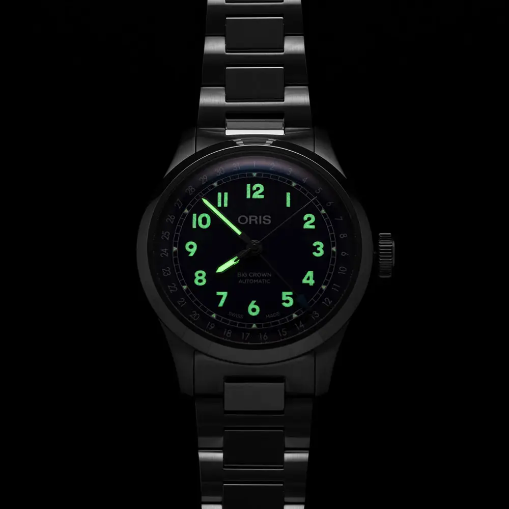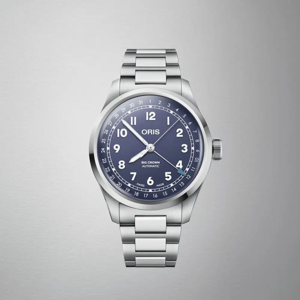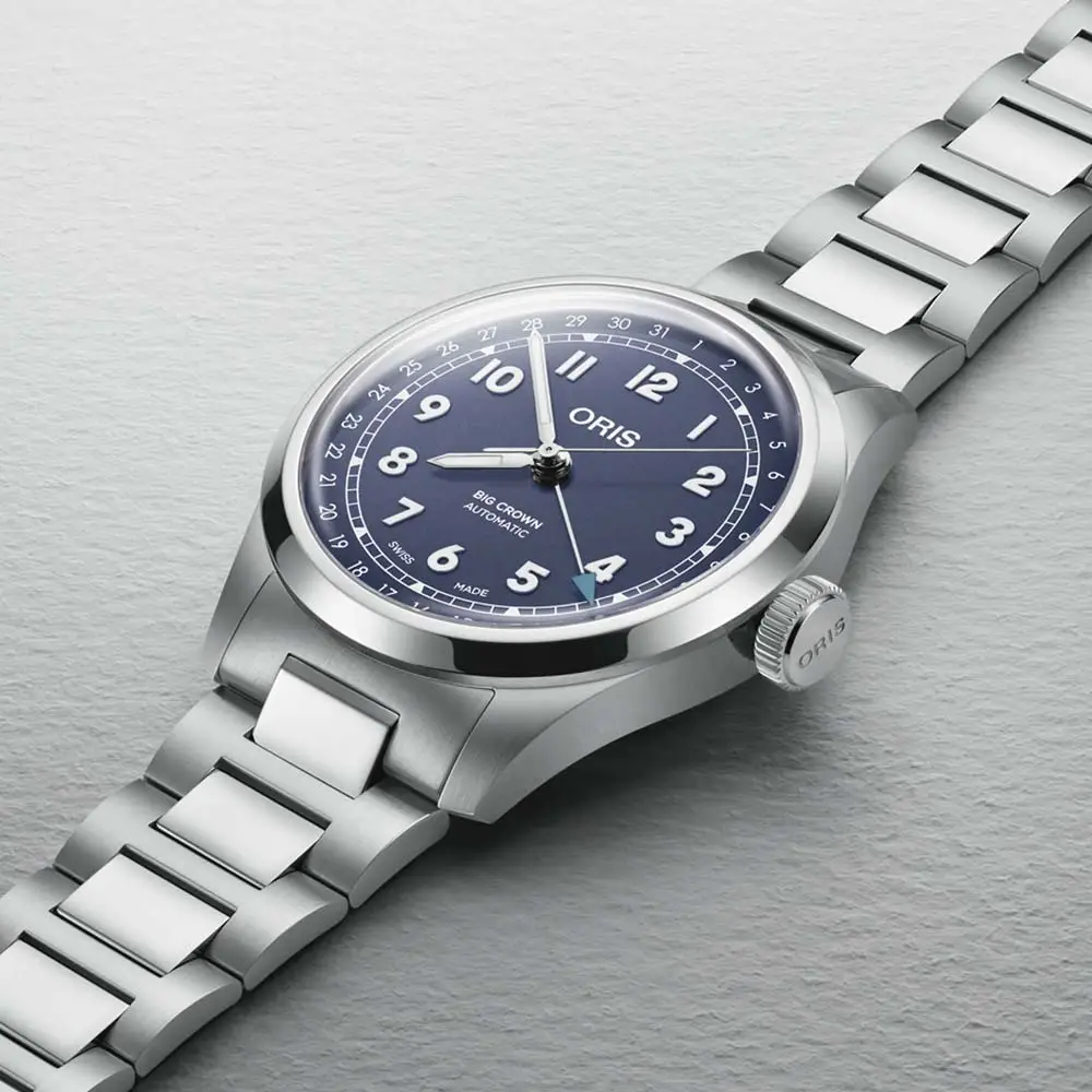 Oris Big Crown là một trong những bộ sưu tập biểu tượng nhất của thương hiệu, ra mắt vào năm 1938 như một mẫu đồng hồ dành cho phi công. Điểm nhấn đặc trưng là núm vặn lớn có răng cưa, được thiết kế để có thể điều chỉnh ngay cả khi đeo găng tay - chi tiết này vẫn gợi nhớ đến nguồn gốc hàng không của bộ sưu tập.