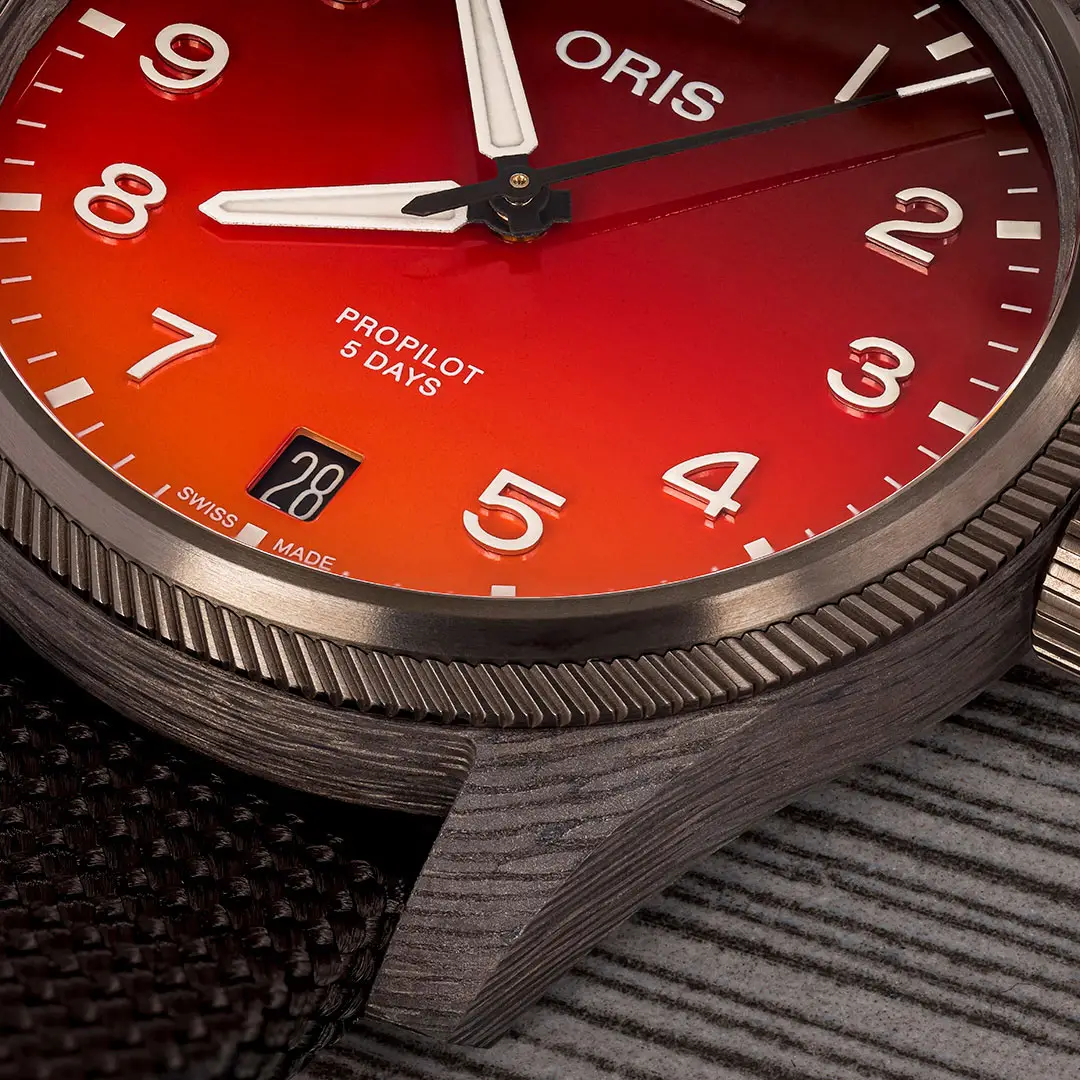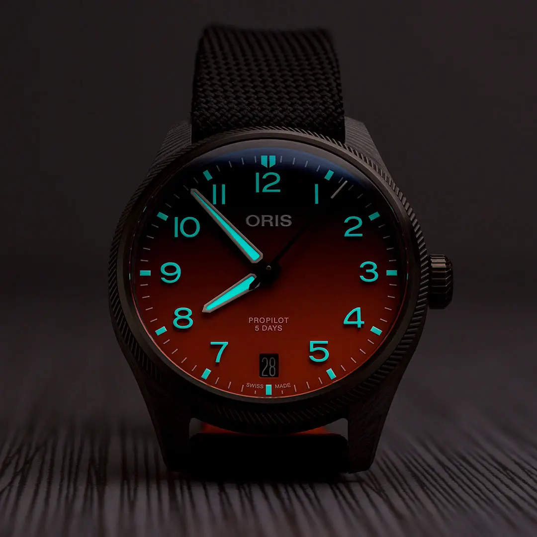 Mặt số với hiệu ứng gradient cam-đỏ tượng trưng cho ngọn lửa, một yếu tố quan trọng trong công việc của Coulson Aviation. Kim và vạch chỉ giờ được phủ Super-LumiNova®, đảm bảo độ hiển thị hoàn hảo ngay cả trong điều kiện ánh sáng yếu.