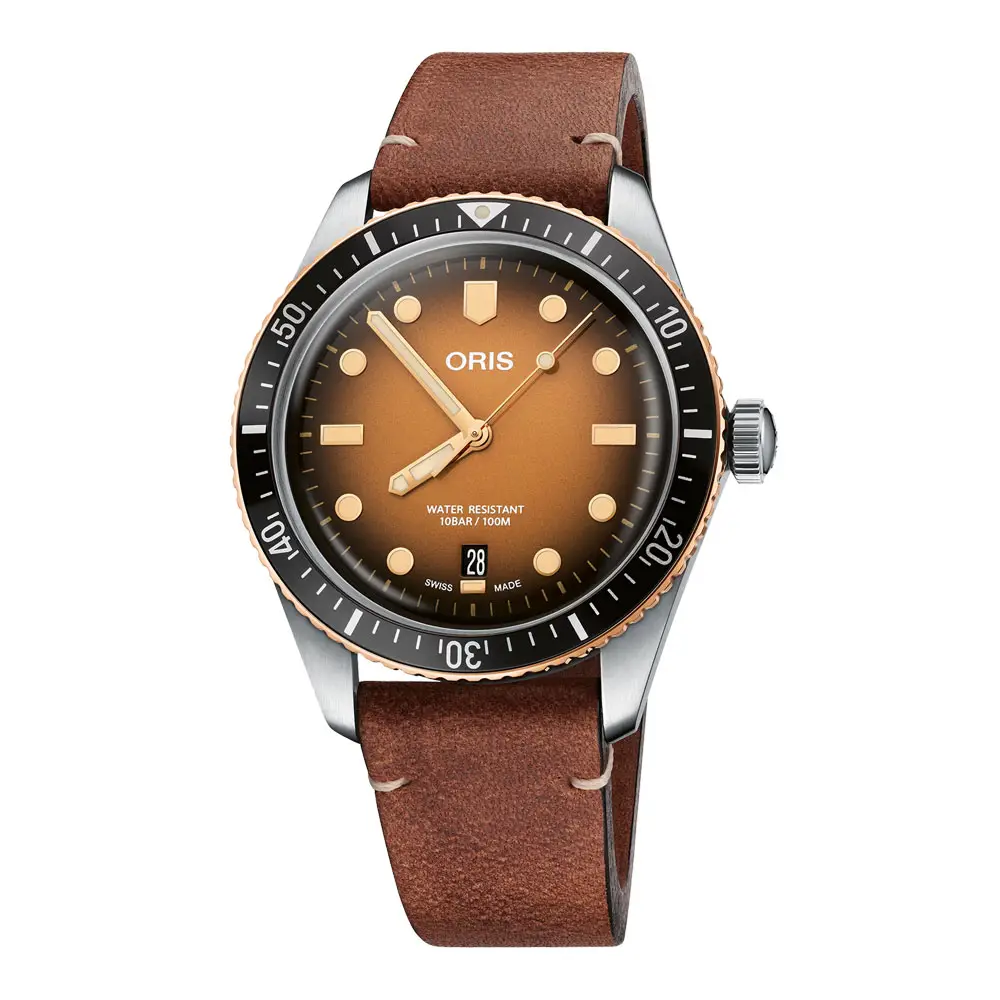 Mẫu Oris Divers Sixty-Five Date 01 733 7707 4356-07 5 20 45 của Oris kết hợp phong cách đồng hồ lặn cổ điển với công nghệ chế tác Thụy Sĩ hiện đại. Vỏ thép không gỉ 40 mm đi cùng vành bezel xoay một chiều bằng đồng (bronze), sẽ tạo lớp patina độc đáo theo thời gian. Mặt số gradient màu nâu với Super-LumiNova® đảm bảo khả năng đọc rõ ràng, được bảo vệ bởi kính sapphire cong phủ chống phản xạ.