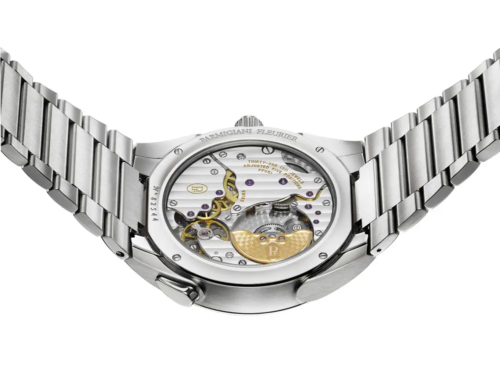 Mẫu đồng hồ được hoàn thiện với dây đeo thép không gỉ tích hợp, chuyển tiếp mượt mà vào vỏ và khóa gập ẩn. Với khả năng chống nước 60 mét, đây là người bạn đồng hành lý tưởng không chỉ cho những chuyến du lịch mà còn cho phong cách sang trọng hàng ngày. Nó hoàn hảo thể hiện triết lý của Parmigiani: sang trọng tinh tế, đổi mới và kỹ thuật chế tác hoàn hảo.