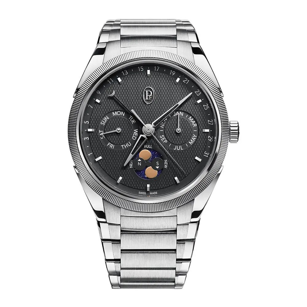Tonda PF nổi bật với vẻ đẹp tối giản: dây đeo tích hợp, vành bezel bạch kim có rãnh mịn, mặt số guilloché thủ công và thiết kế siêu mỏng. Bộ sưu tập bao gồm các mẫu sử dụng bộ máy micro-rotor, chronograph, lịch và các chức năng phức tạp như GMT Rattrapante. Tất cả đều toát lên tinh thần xa xỉ kín đáo – dành cho những ai hiểu biết, không phô trương.