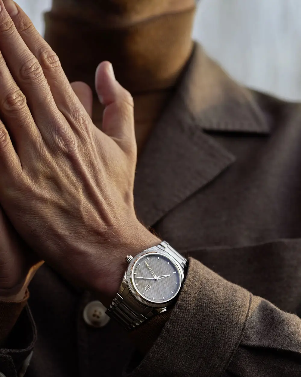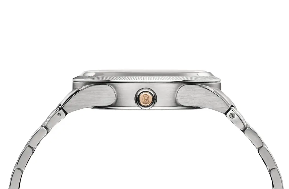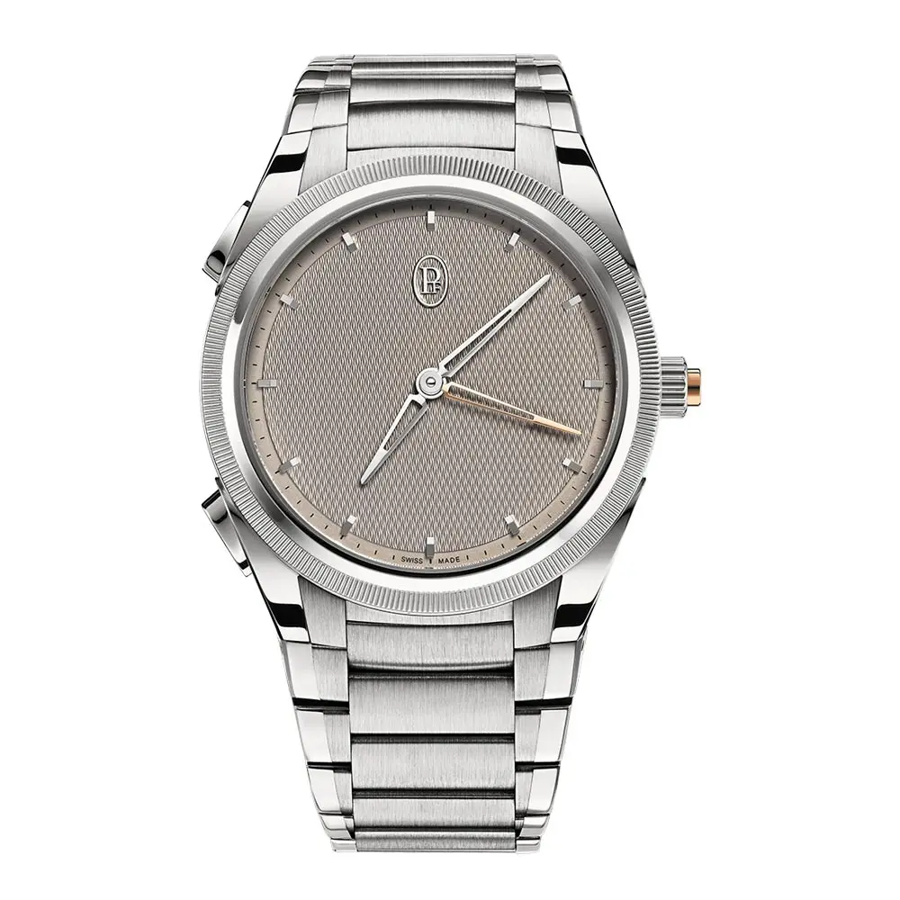Vỏ đồng hồ sang trọng 40 mm bằng thép không gỉ đánh bóng được kết hợp với vành bezel bằng bạch kim 950 và mặt số chạm khắc tay màu "xám cát". Toàn bộ được hoàn thiện bằng bộ máy thép tích hợp và kính sapphire có lớp chống phản chiếu.