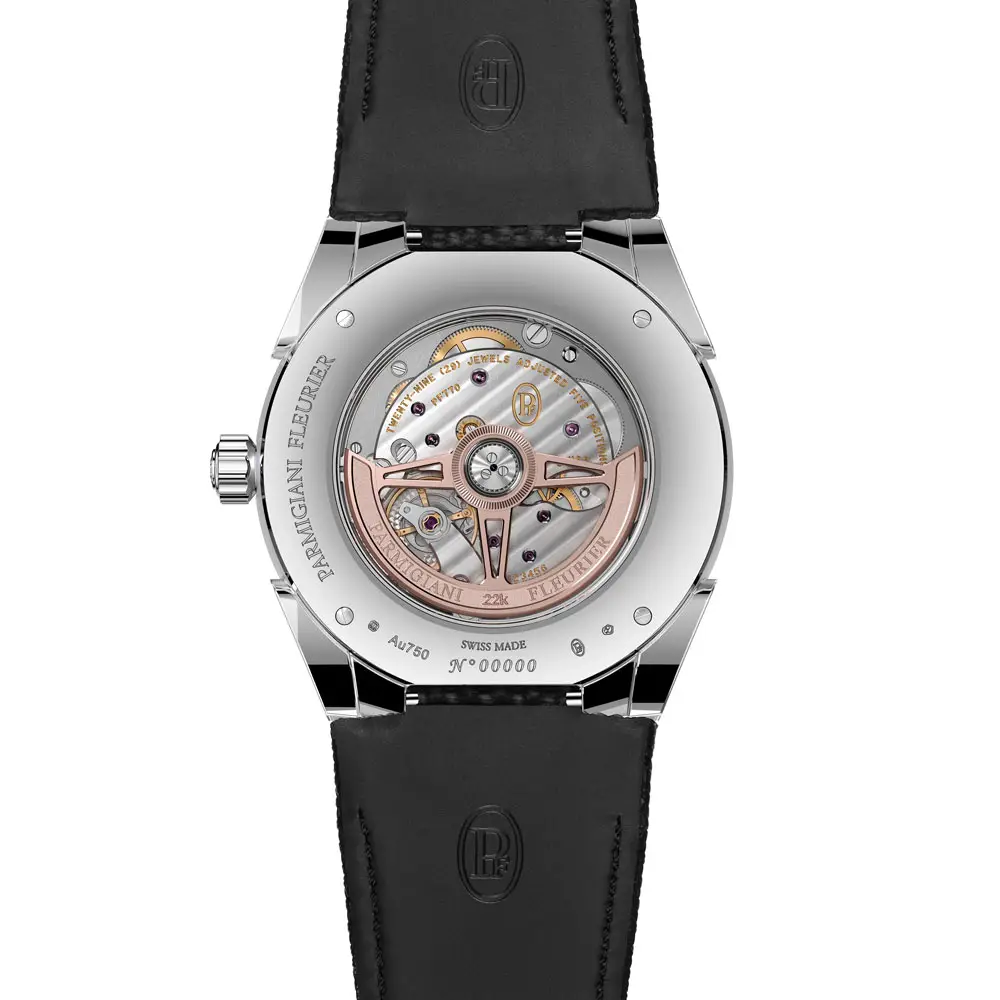 Bên trong là bộ máy in-house PF770 với cơ chế lên dây tự động, dự trữ năng lượng 60 giờ và rotor bằng vàng hồng 22 carat, có thể nhìn thấy qua mặt số sapphire trong suốt. Bộ máy được trang trí bằng các kỹ thuật chế tác đồng hồ truyền thống và mang lại độ chính xác cao cùng giá trị thẩm mỹ.