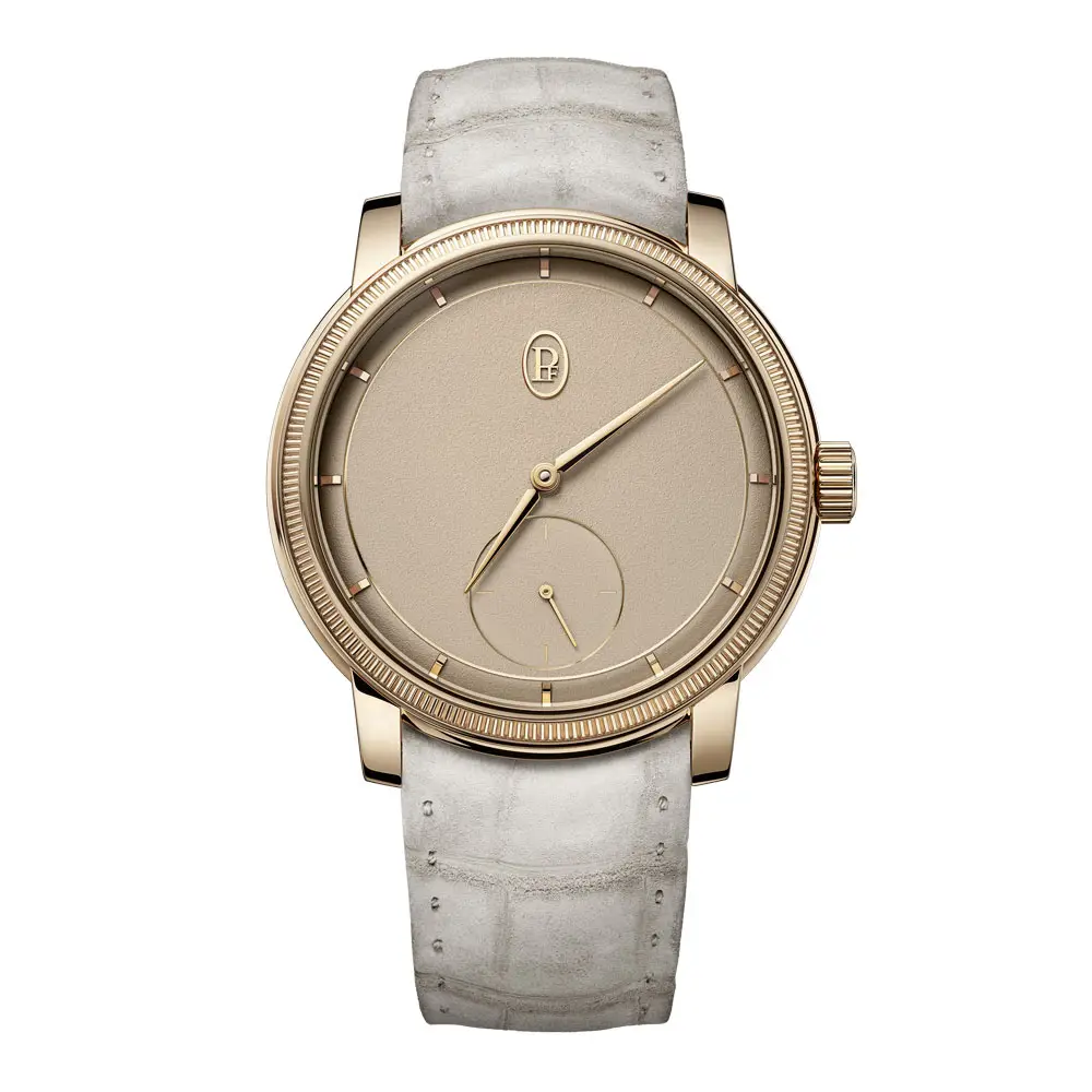 Parmigiani Toric Petite Seconde Rose Gold “Dune” mang vẻ đẹp thanh lịch thuần khiết và phong cách vượt thời gian. Vỏ đồng hồ đường kính 40,6 mm được chế tác từ vàng hồng 18K, kết hợp hoàn hảo với mặt số vàng nguyên khối hoàn thiện thủ công trong sắc thái “Dune”. Tông màu tinh tế này gợi nhớ đến những đồi cát, tạo nên dấu ấn độc đáo.