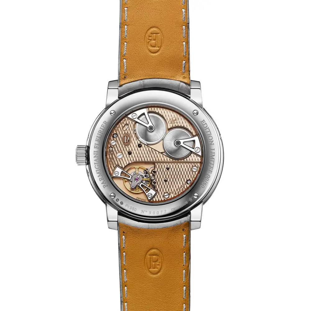 Bên trong là bộ máy in-house PF733 lên cót tay, gồm 265 chi tiết và 29 chân kính. Bộ máy hoạt động ở tần số 4 Hz và mang lại 60 giờ dự trữ năng lượng. Chức năng lịch vạn niên hiển thị ngày, thứ, tháng và năm nhuận, bố trí trên hai mặt số phụ để tối ưu khả năng quan sát.