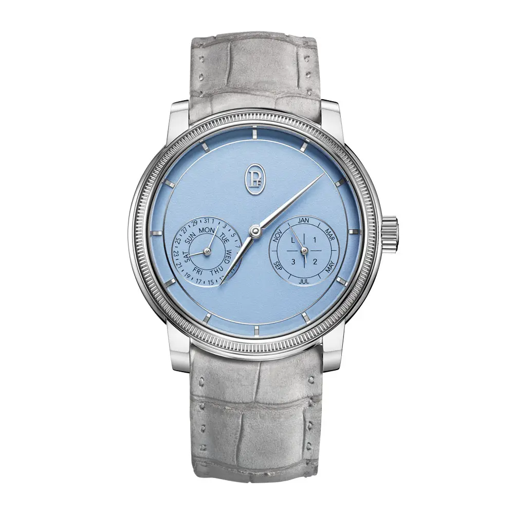 Parmigiani Toric Quantième Perpétuel “Morning Blue” (PFH952-2010002-300181) là chiếc đồng hồ sang trọng dành cho những dịp đặc biệt, kết hợp chức năng lịch vạn niên với vẻ đẹp thanh lịch vượt thời gian. Vỏ platinum 950 với bezel Toric đặc trưng đi kèm mặt số hoàn thiện thủ công màu “Morning Blue”, tôn lên chiều sâu và sự tinh tế.