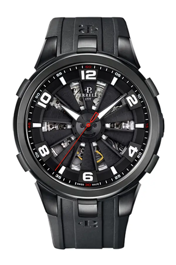 Một chiếc đồng hồ nam thể thao của Perrelet dành cho những quý ông năng động, yêu thích thiết kế chính xác và kỹ thuật chế tác tinh xảo. Mẫu đồng hồ này thuộc bộ sưu tập Turbine. Đồng hồ có màu đen cổ điển, được tô điểm bởi những chi tiết trắng nhỏ tinh tế trên mặt số. Vỏ và vành bezel được làm từ thép và lớp phủ PVD đen, trong khi dây đeo được làm từ cao su.