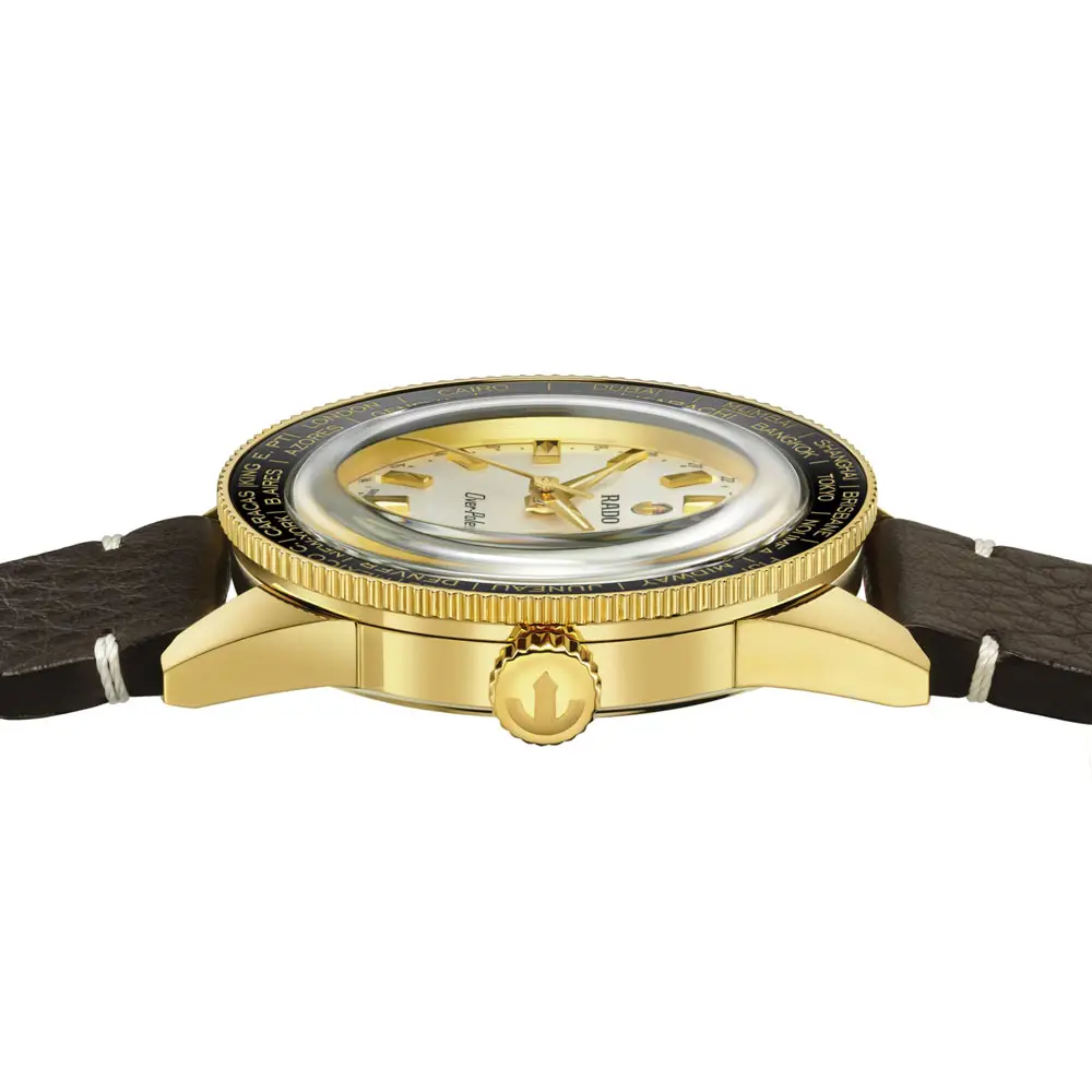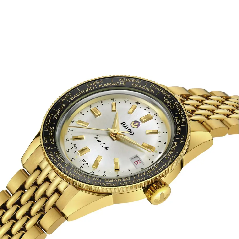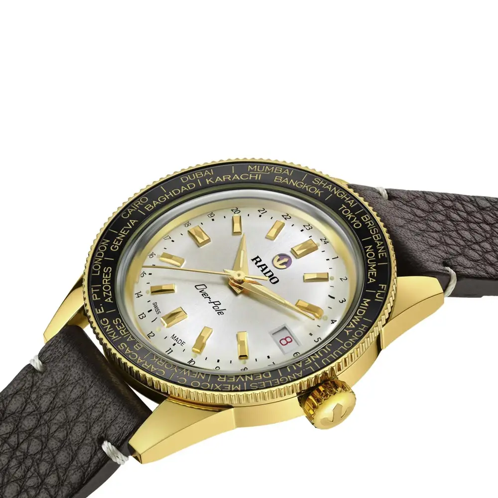 Phiên bản giới hạn Rado Captain Cook Over-Pole R32193018 là sự tôn vinh tinh thần phiêu lưu và di sản khám phá của thương hiệu Rado. Mẫu đồng hồ đặc biệt này kết hợp giữa phong cách cổ điển và công nghệ chế tác đồng hồ hiện đại. Vỏ tròn đường kính 39 mm được làm từ thép không gỉ mạ vàng vàng, mang lại vẻ ngoài sang trọng. Mặt số màu bạc được kết hợp với vành bezel bằng gốm có khắc tên các thành phố toàn cầu.