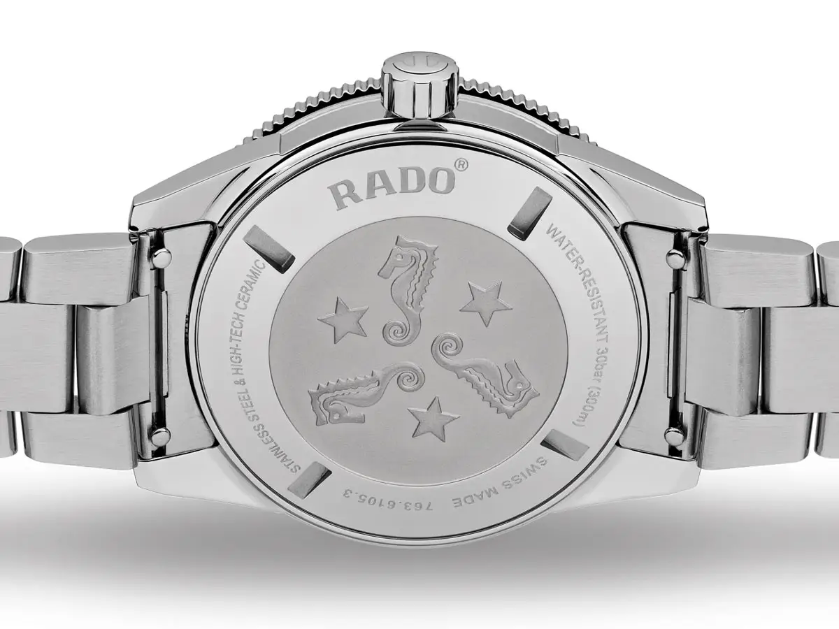 Bên trong là bộ máy cơ tự động Rado R763 với dự trữ năng lượng lên đến 80 giờ. Mặt số xanh sang trọng hiển thị lịch ngày ở vị trí 3 giờ, và kính sapphire chống phản chiếu giúp dễ dàng quan sát trong mọi điều kiện ánh sáng.