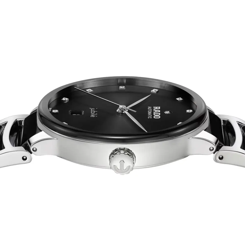 Rado Centrix Automatic Diamonds R30018742 là sự kết hợp tinh tế giữa thanh lịch và hiệu suất. Mặt số đen Sunray đính 12 viên kim cương, kết hợp cùng vỏ thép không gỉ chắc chắn và mắt dây bằng gốm công nghệ cao màu đen, tạo nên phong cách hiện đại và sang trọng.