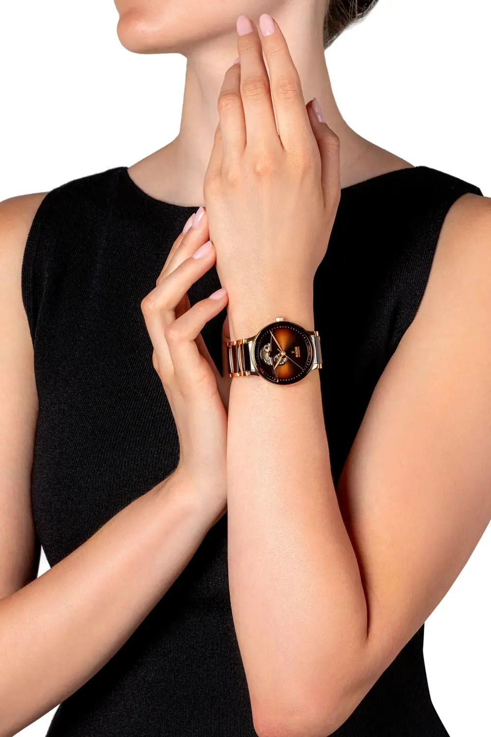 Mặt số màu nâu với thiết kế Open Heart để lộ bộ máy cơ tự động chính xác cùng dự trữ năng lượng khoảng 80 giờ. Kính sapphire bảo vệ mặt số, đảm bảo độ rõ nét và độ bền tối đa. Dây đeo màu nâu làm từ gốm, thép không gỉ và mạ vàng hồng được trang bị khóa gập để mang lại sự an toàn và thoải mái khi đeo.
