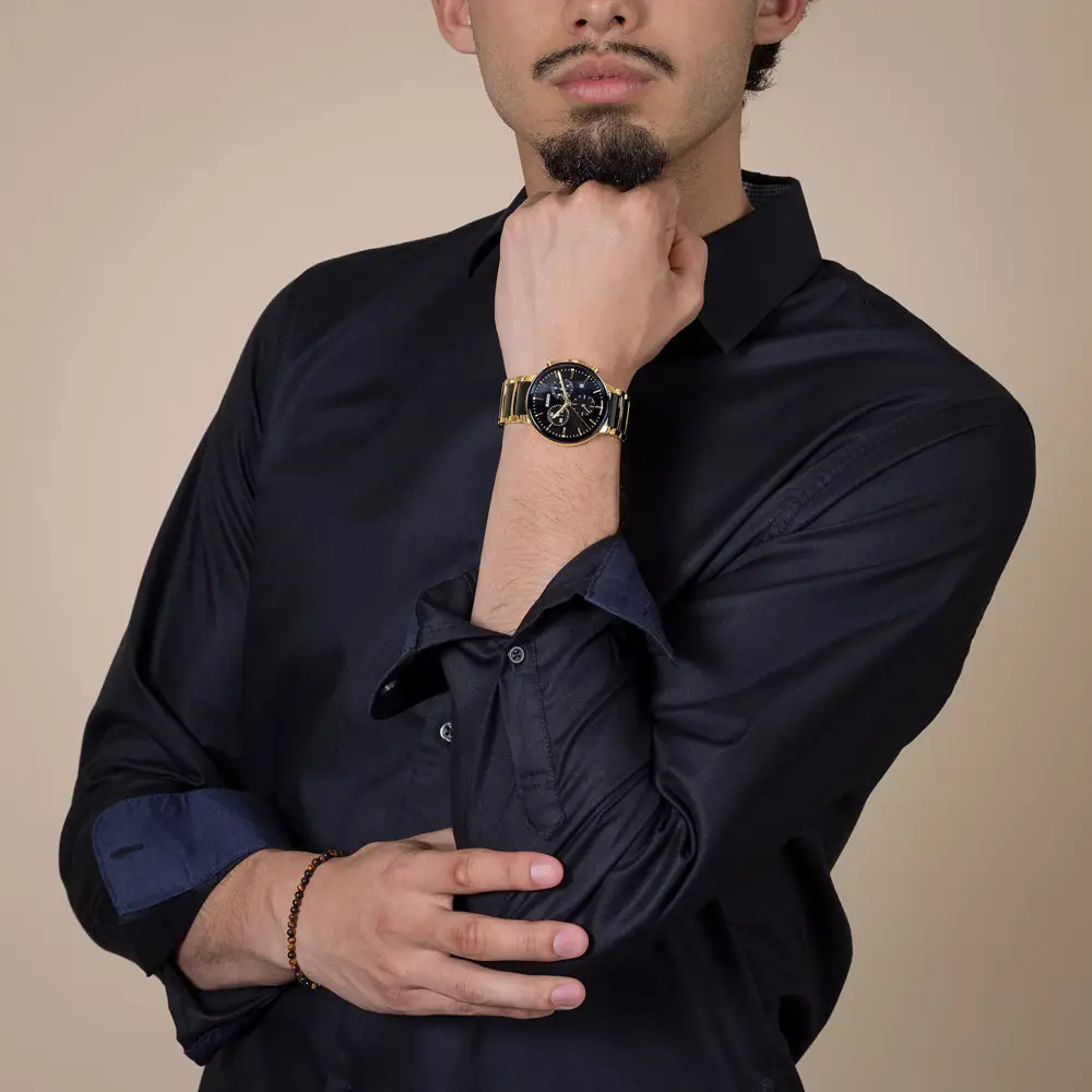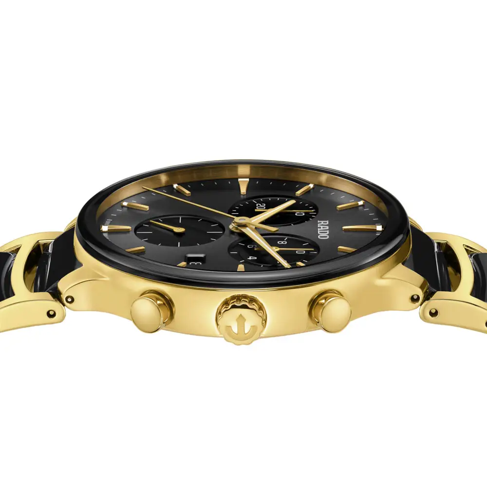 Đồng hồ Rado Centrix Chronograph kết hợp giữa tính năng thể thao và thiết kế sang trọng. Vỏ đồng hồ bằng thép không gỉ có đường kính 41 mm với lớp hoàn thiện PVD màu vàng được kết hợp với mặt kính sapphire cong nhẹ có lớp phủ chống phản chiếu, giúp bảo vệ đồng hồ khỏi trầy xước. Mặt số màu đen với các chỉ số và mặt số phụ màu vàng mang đến vẻ hiện đại cùng độ dễ đọc cao. Khả năng chống nước lên đến 50 mét đảm bảo độ bền bỉ cho việc sử dụng hàng ngày.
