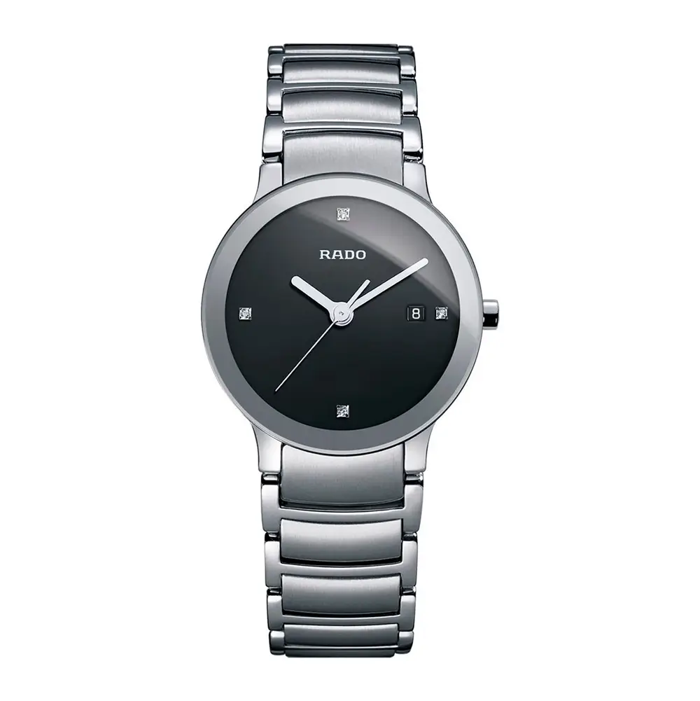 Rado Centrix Diamonds R30928713 là mẫu đồng hồ nữ thanh lịch, kết hợp hài hòa giữa phong cách cổ điển và sự tinh tế sang trọng. Vỏ đồng hồ tròn bằng thép không gỉ đường kính 28 mm nhỏ gọn, phù hợp cho cả sử dụng hàng ngày lẫn các dịp đặc biệt. Mặt kính sapphire chống trầy xước hiệu quả, bảo vệ mặt số màu đen với các cọc số bằng kim cương lấp lánh.