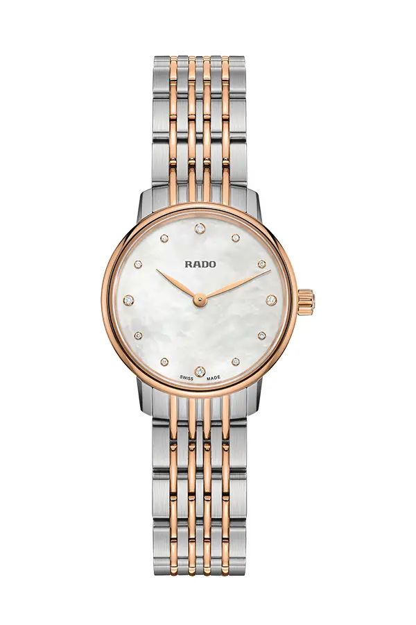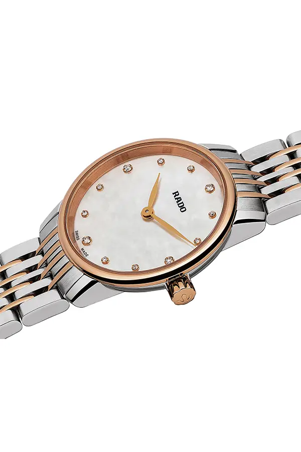 Đồng hồ nữ Rado Coupole Classic Diamond R gây ấn tượng đặc biệt với thiết kế hai tông màu thép và vàng hồng. Mặt số màu trắng ngọc trai, trên đó các con số được thay thế bằng những viên kim cương quý giá, là điểm nhấn không thể bỏ qua. Kích thước vỏ đồng hồ là 27 mm. Đồng hồ có khả năng chống nước lên đến 50 mét.