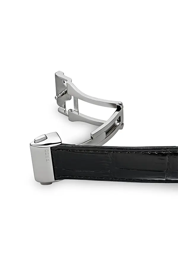 Bên trong là bộ máy cơ tự động vận hành chính xác và ổn định, không cần lên dây mỗi ngày. Dây da màu đen với khóa gập hoàn thiện vẻ ngoài thanh lịch và vượt thời gian, dễ dàng kết hợp với trang phục công sở lẫn thường ngày.